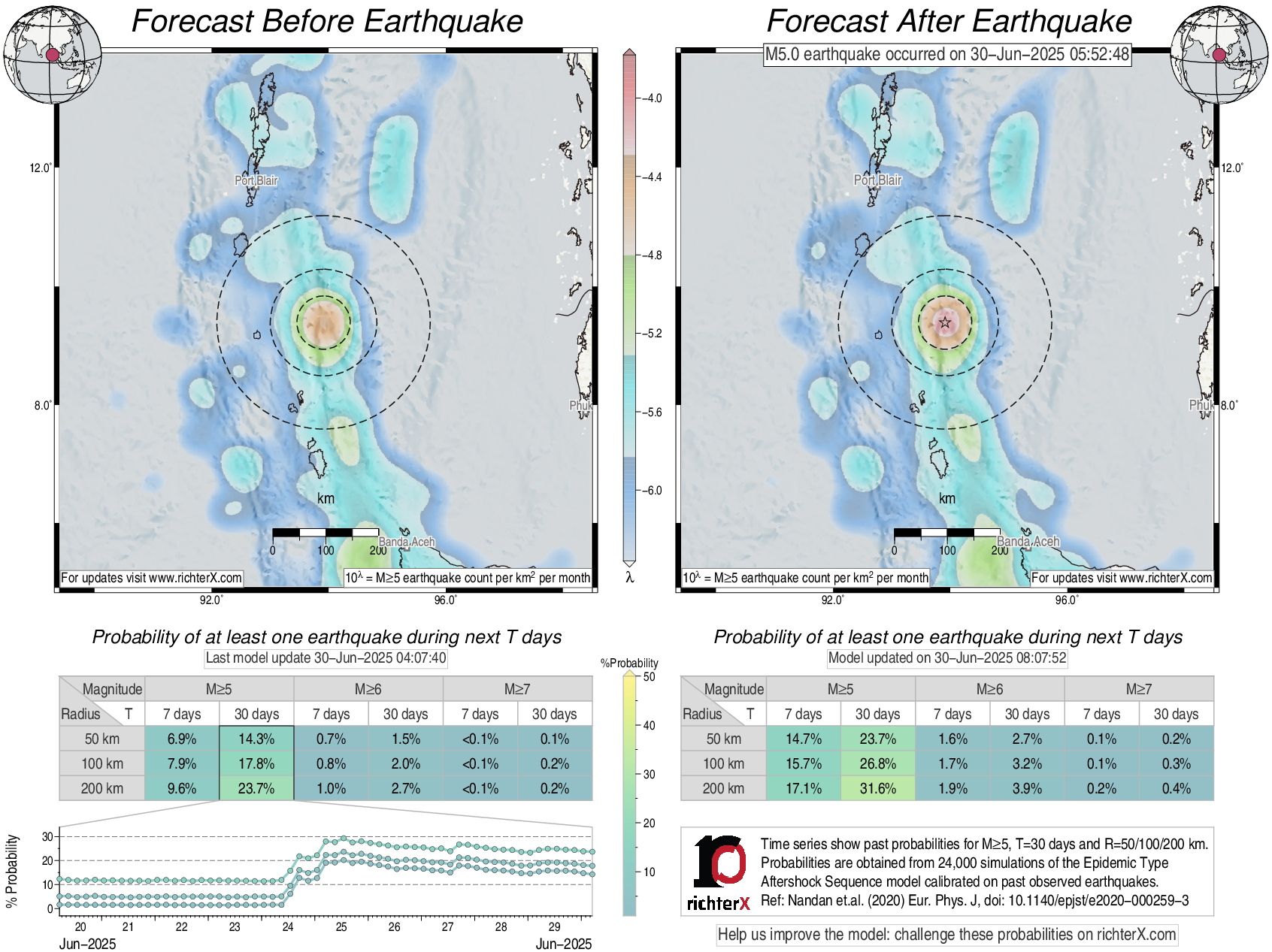 Description: Above is our model's last forecast before the earthquake (left side) and the first forecast after the earthquake (right side). The probabilities are obtained by counting the fraction of simulations that had at least one earthquake above different magnitudes (M5, M6 or M7) within different areas (50, 100 or 200 km) in the next 7 or 30 days. The last 10 day time history of the probabilities (for M5+ during the next 30 days) is shown on the lower left side.