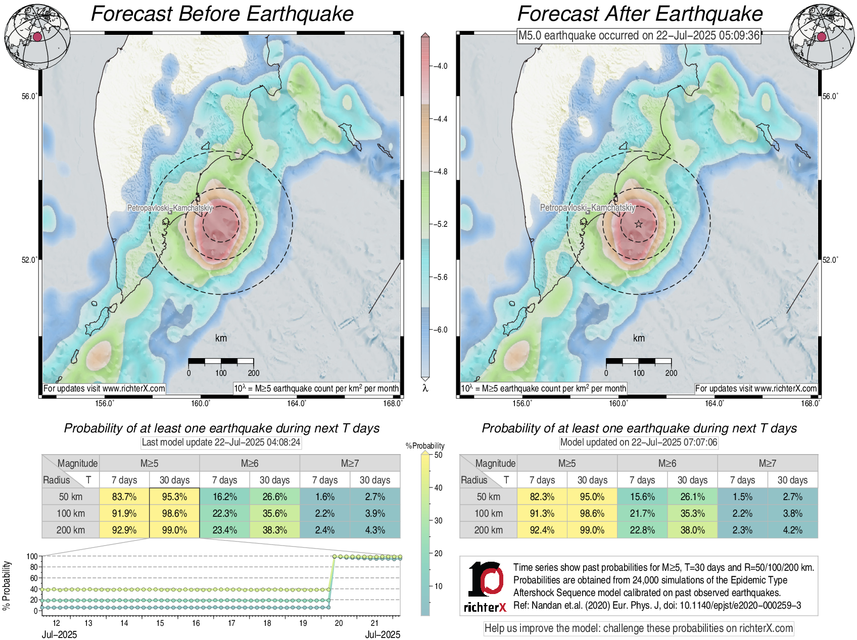 Description: Above is our model's last forecast before the earthquake (left side) and the first forecast after the earthquake (right side). The probabilities are obtained by counting the fraction of simulations that had at least one earthquake above different magnitudes (M5, M6 or M7) within different areas (50, 100 or 200 km) in the next 7 or 30 days. The last 10 day time history of the probabilities (for M5+ during the next 30 days) is shown on the lower left side.