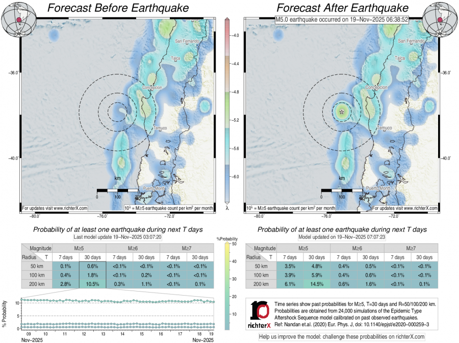 Description: Above is our model's last forecast before the earthquake (left side) and the first forecast after the earthquake (right side). The probabilities are obtained by counting the fraction of simulations that had at least one earthquake above different magnitudes (M5, M6 or M7) within different areas (50, 100 or 200 km) in the next 7 or 30 days. The last 10 day time history of the probabilities (for M5+ during the next 30 days) is shown on the lower left side.
