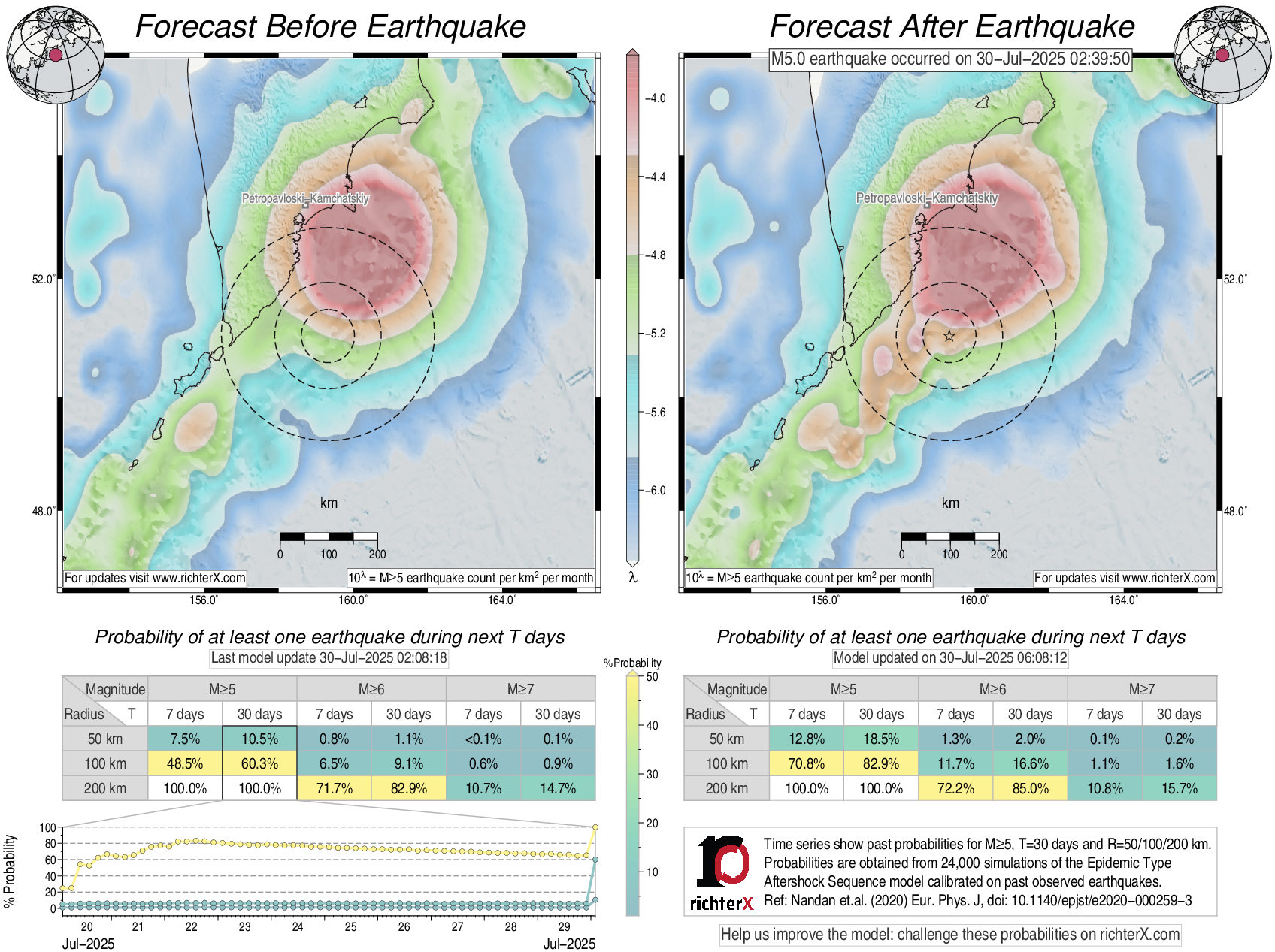 Description: Above is our model's last forecast before the earthquake (left side) and the first forecast after the earthquake (right side). The probabilities are obtained by counting the fraction of simulations that had at least one earthquake above different magnitudes (M5, M6 or M7) within different areas (50, 100 or 200 km) in the next 7 or 30 days. The last 10 day time history of the probabilities (for M5+ during the next 30 days) is shown on the lower left side.