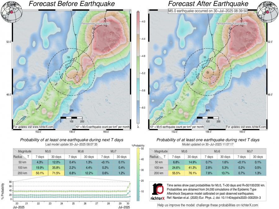 Description: Above is our model's last forecast before the earthquake (left side) and the first forecast after the earthquake (right side). The probabilities are obtained by counting the fraction of simulations that had at least one earthquake above different magnitudes (M5, M6 or M7) within different areas (50, 100 or 200 km) in the next 7 or 30 days. The last 10 day time history of the probabilities (for M5+ during the next 30 days) is shown on the lower left side.