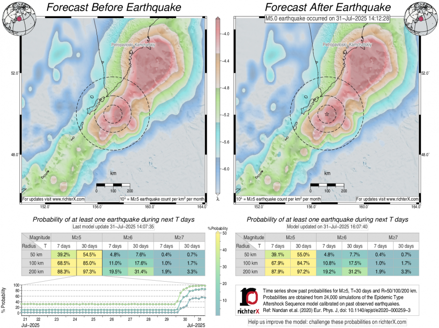 Description: Above is our model's last forecast before the earthquake (left side) and the first forecast after the earthquake (right side). The probabilities are obtained by counting the fraction of simulations that had at least one earthquake above different magnitudes (M5, M6 or M7) within different areas (50, 100 or 200 km) in the next 7 or 30 days. The last 10 day time history of the probabilities (for M5+ during the next 30 days) is shown on the lower left side.