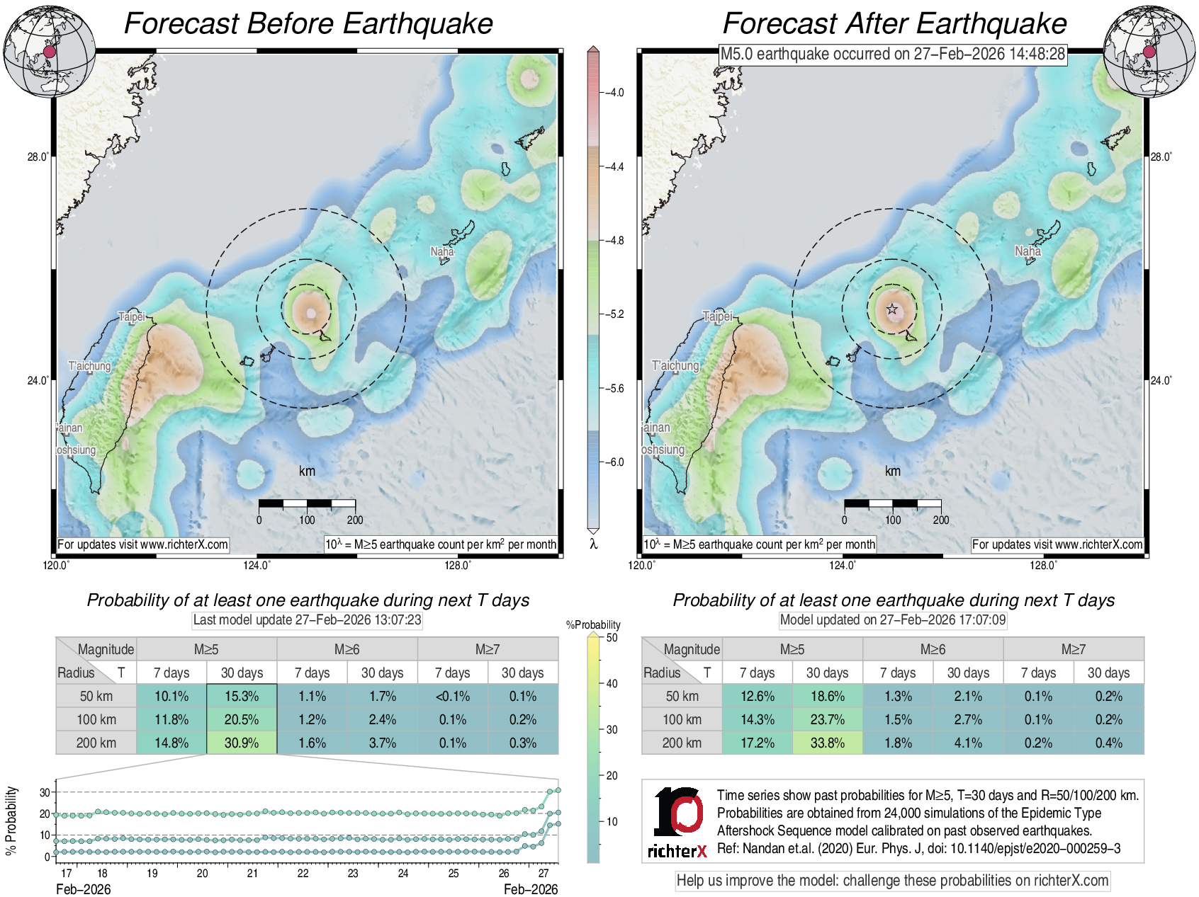 Description: Above is our model's last forecast before the earthquake (left side) and the first forecast after the earthquake (right side). The probabilities are obtained by counting the fraction of simulations that had at least one earthquake above different magnitudes (M5, M6 or M7) within different areas (50, 100 or 200 km) in the next 7 or 30 days. The last 10 day time history of the probabilities (for M5+ during the next 30 days) is shown on the lower left side.