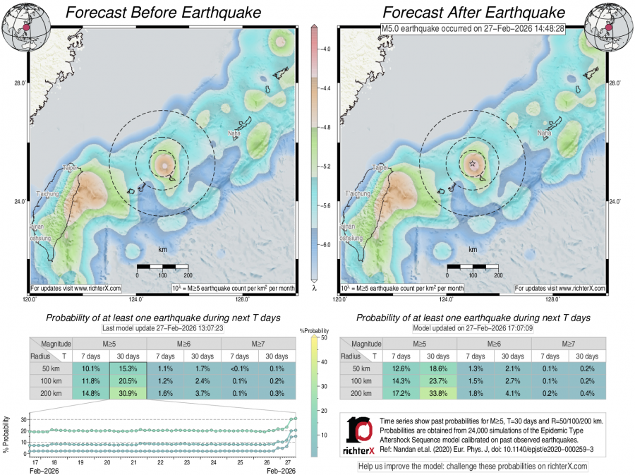 Earthquake Forecast following M5 northeast of Taiwan