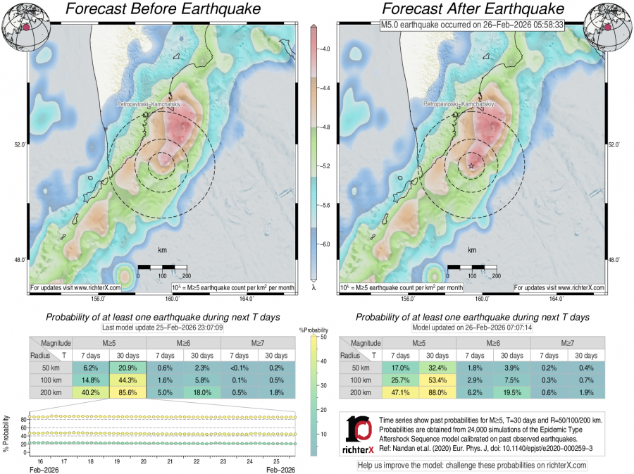 Description: Above is our model's last forecast before the earthquake (left side) and the first forecast after the earthquake (right side). The probabilities are obtained by counting the fraction of simulations that had at least one earthquake above different magnitudes (M5, M6 or M7) within different areas (50, 100 or 200 km) in the next 7 or 30 days. The last 10 day time history of the probabilities (for M5+ during the next 30 days) is shown on the lower left side.