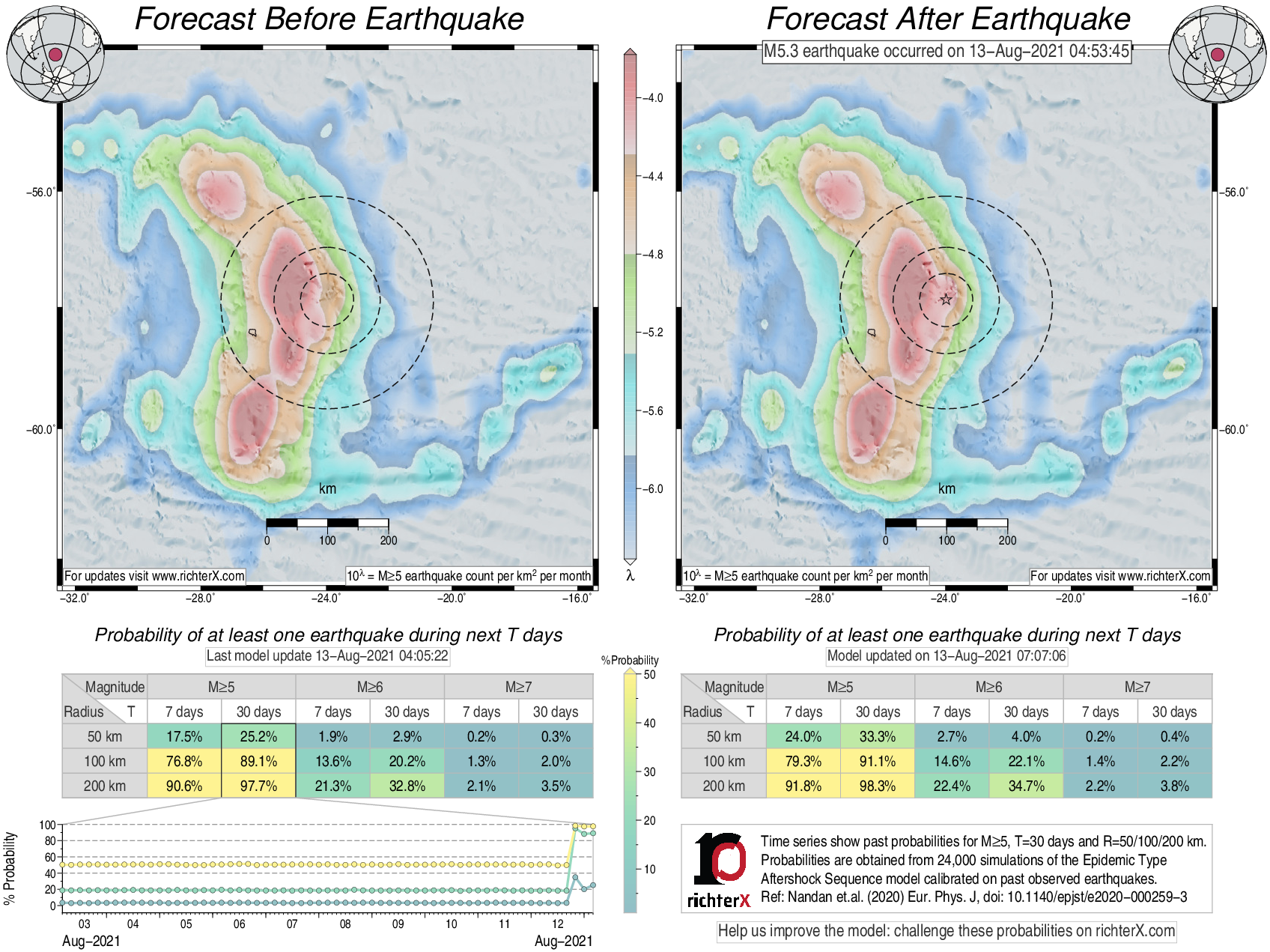 Description: Above is our model's last forecast before the earthquake (left side) and the first forecast after the earthquake (right side). The probabilities are obtained by counting the fraction of simulations that had at least one earthquake above different magnitudes (M5, M6 or M7) within different areas (50, 100 or 200 km) in the next 7 or 30 days. The last 10 day time history of the probabilities (for M5+ during the next 30 days) is shown on the lower left side.