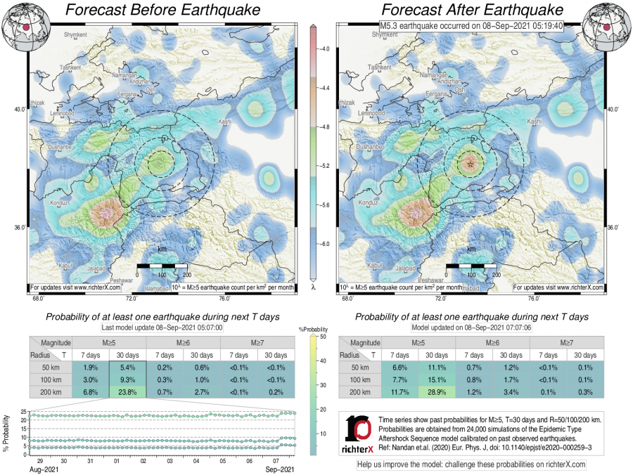 Description: Above is our model's last forecast before the earthquake (left side) and the first forecast after the earthquake (right side). The probabilities are obtained by counting the fraction of simulations that had at least one earthquake above different magnitudes (M5, M6 or M7) within different areas (50, 100 or 200 km) in the next 7 or 30 days. The last 10 day time history of the probabilities (for M5+ during the next 30 days) is shown on the lower left side.