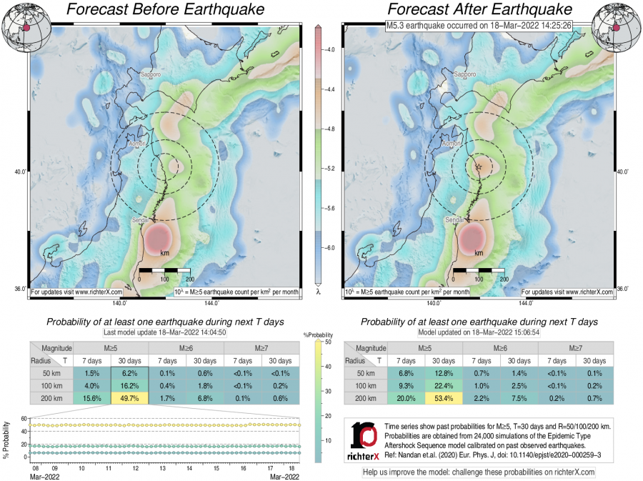 Earthquake Forecast following M5.3 offshore east Honshu, Japan