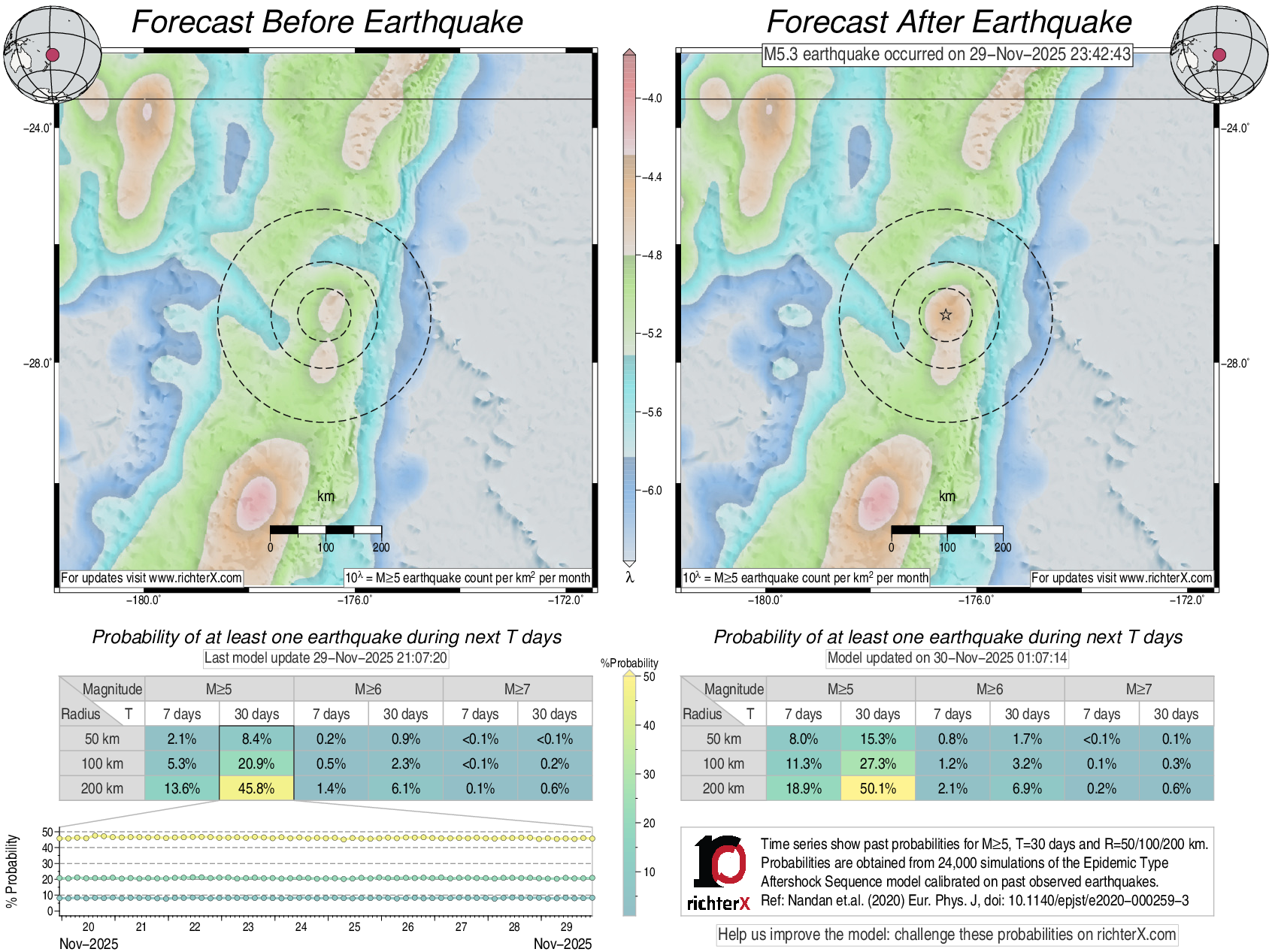 Description: Above is our model's last forecast before the earthquake (left side) and the first forecast after the earthquake (right side). The probabilities are obtained by counting the fraction of simulations that had at least one earthquake above different magnitudes (M5, M6 or M7) within different areas (50, 100 or 200 km) in the next 7 or 30 days. The last 10 day time history of the probabilities (for M5+ during the next 30 days) is shown on the lower left side.