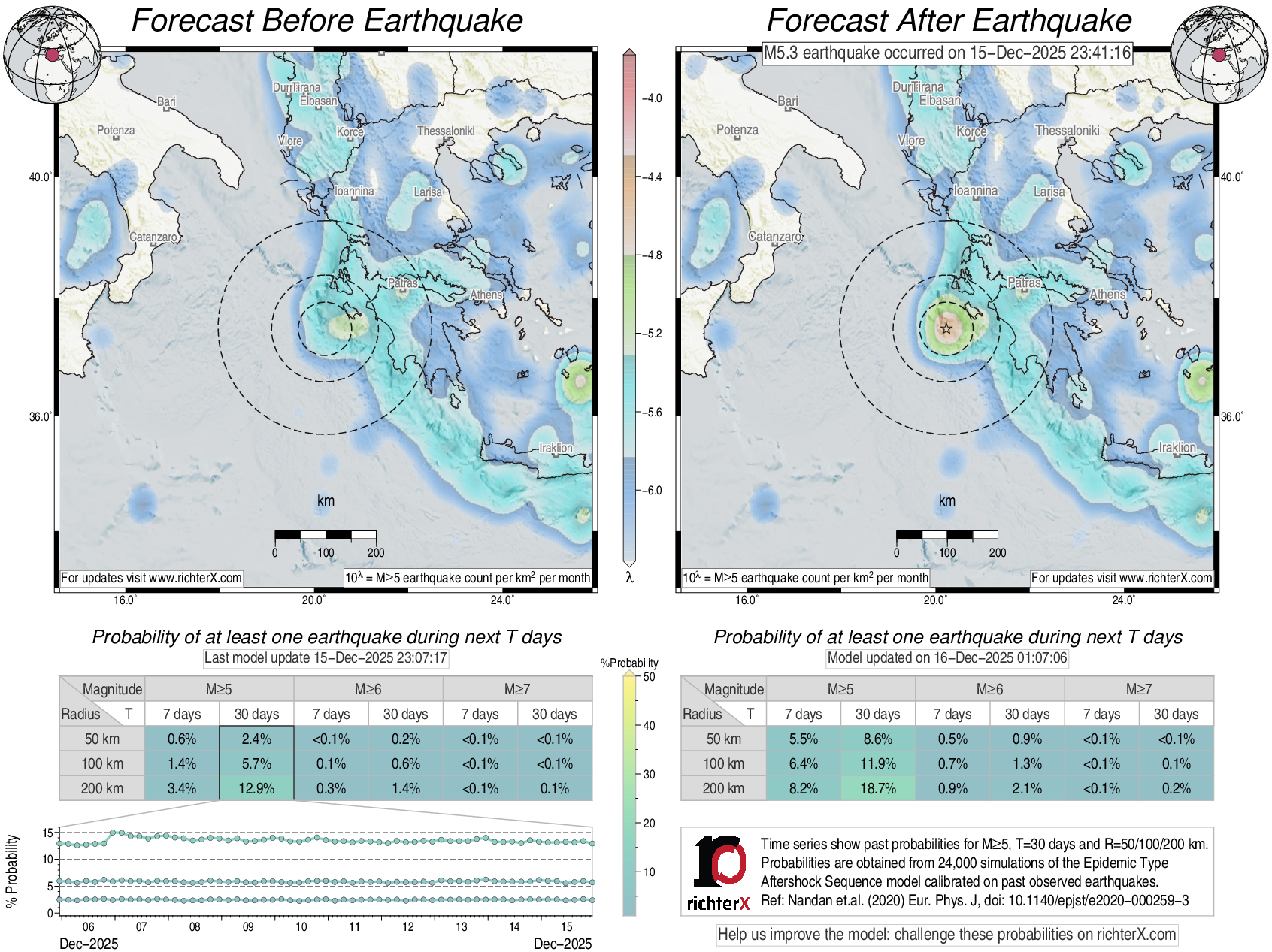 Description: Above is our model's last forecast before the earthquake (left side) and the first forecast after the earthquake (right side). The probabilities are obtained by counting the fraction of simulations that had at least one earthquake above different magnitudes (M5, M6 or M7) within different areas (50, 100 or 200 km) in the next 7 or 30 days. The last 10 day time history of the probabilities (for M5+ during the next 30 days) is shown on the lower left side.