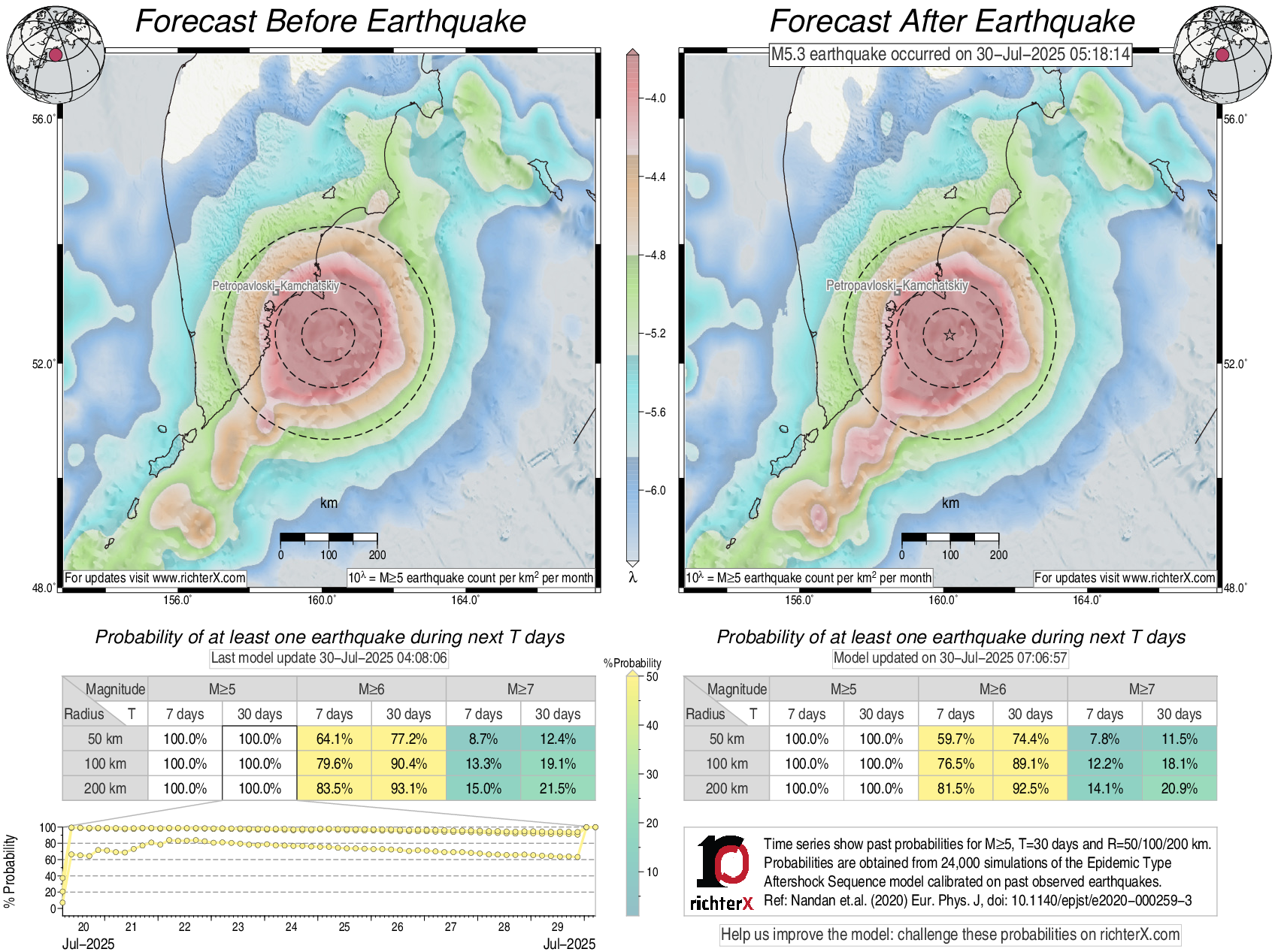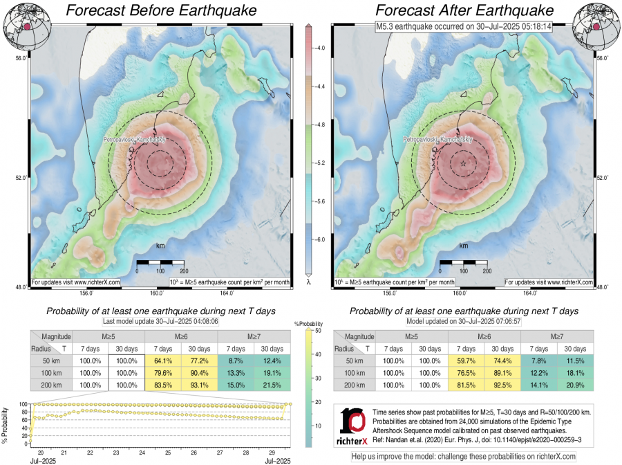 Description: Above is our model's last forecast before the earthquake (left side) and the first forecast after the earthquake (right side). The probabilities are obtained by counting the fraction of simulations that had at least one earthquake above different magnitudes (M5, M6 or M7) within different areas (50, 100 or 200 km) in the next 7 or 30 days. The last 10 day time history of the probabilities (for M5+ during the next 30 days) is shown on the lower left side.