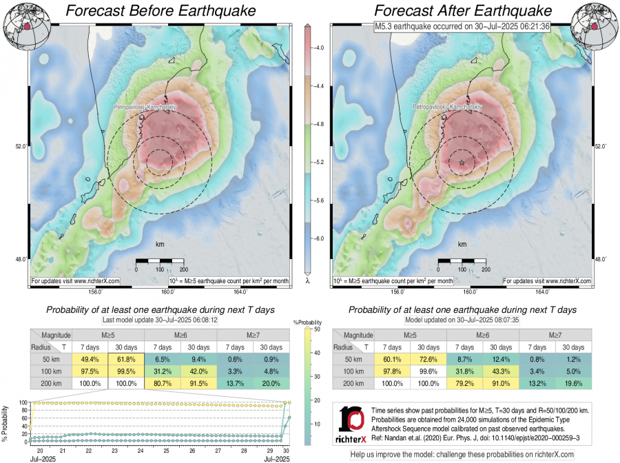 Description: Above is our model's last forecast before the earthquake (left side) and the first forecast after the earthquake (right side). The probabilities are obtained by counting the fraction of simulations that had at least one earthquake above different magnitudes (M5, M6 or M7) within different areas (50, 100 or 200 km) in the next 7 or 30 days. The last 10 day time history of the probabilities (for M5+ during the next 30 days) is shown on the lower left side.