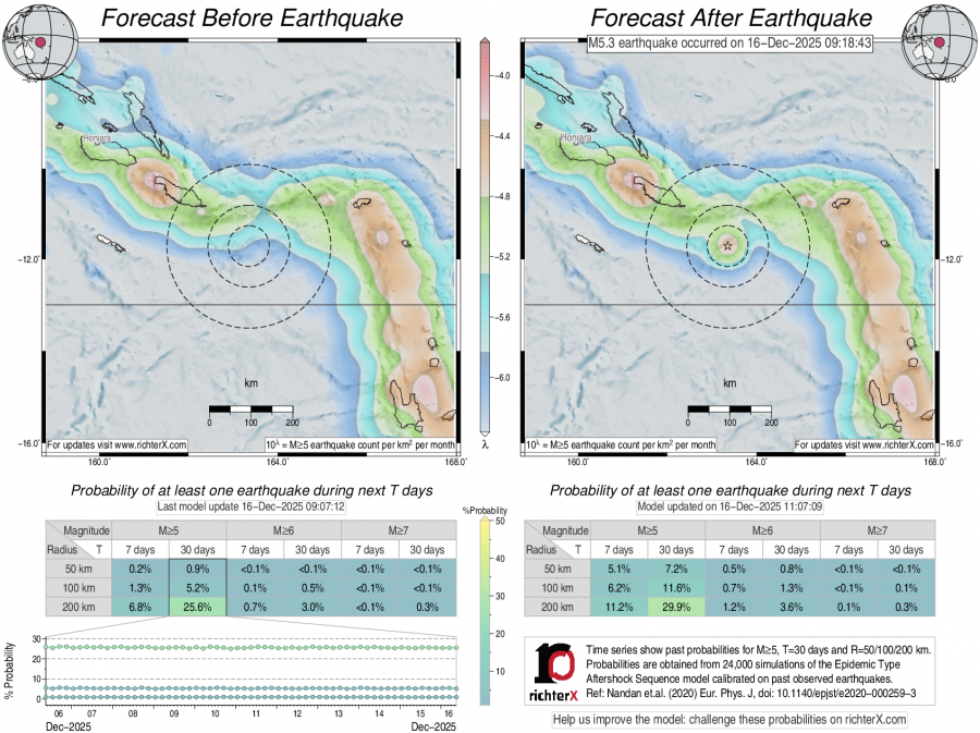 Description: Above is our model's last forecast before the earthquake (left side) and the first forecast after the earthquake (right side). The probabilities are obtained by counting the fraction of simulations that had at least one earthquake above different magnitudes (M5, M6 or M7) within different areas (50, 100 or 200 km) in the next 7 or 30 days. The last 10 day time history of the probabilities (for M5+ during the next 30 days) is shown on the lower left side.