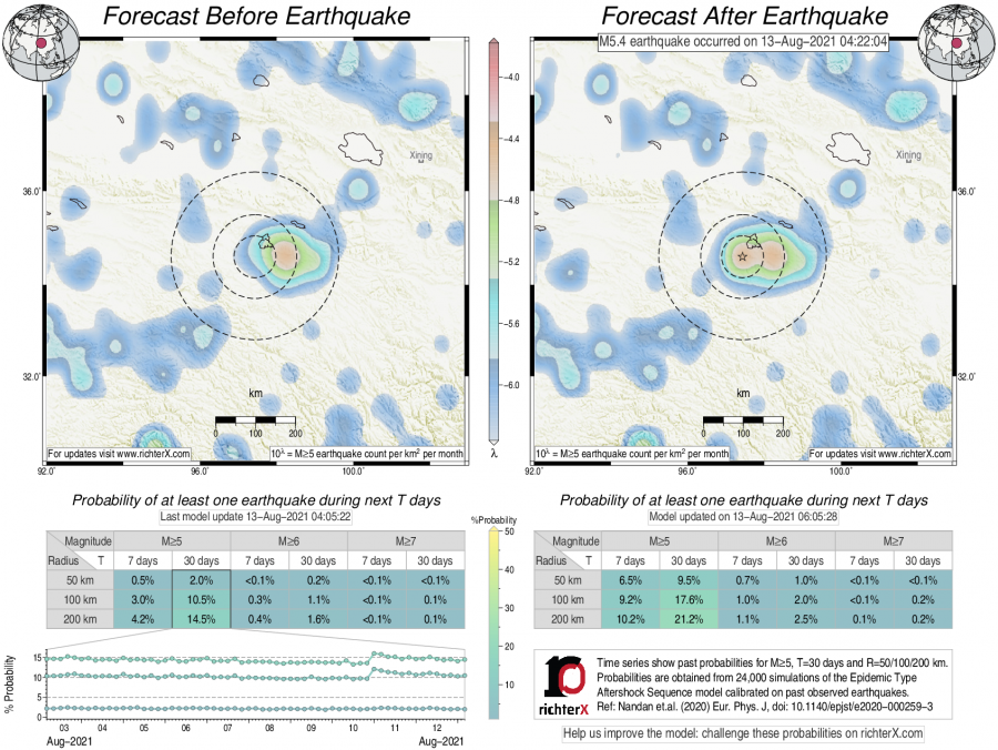 Description: Above is our model's last forecast before the earthquake (left side) and the first forecast after the earthquake (right side). The probabilities are obtained by counting the fraction of simulations that had at least one earthquake above different magnitudes (M5, M6 or M7) within different areas (50, 100 or 200 km) in the next 7 or 30 days. The last 10 day time history of the probabilities (for M5+ during the next 30 days) is shown on the lower left side.