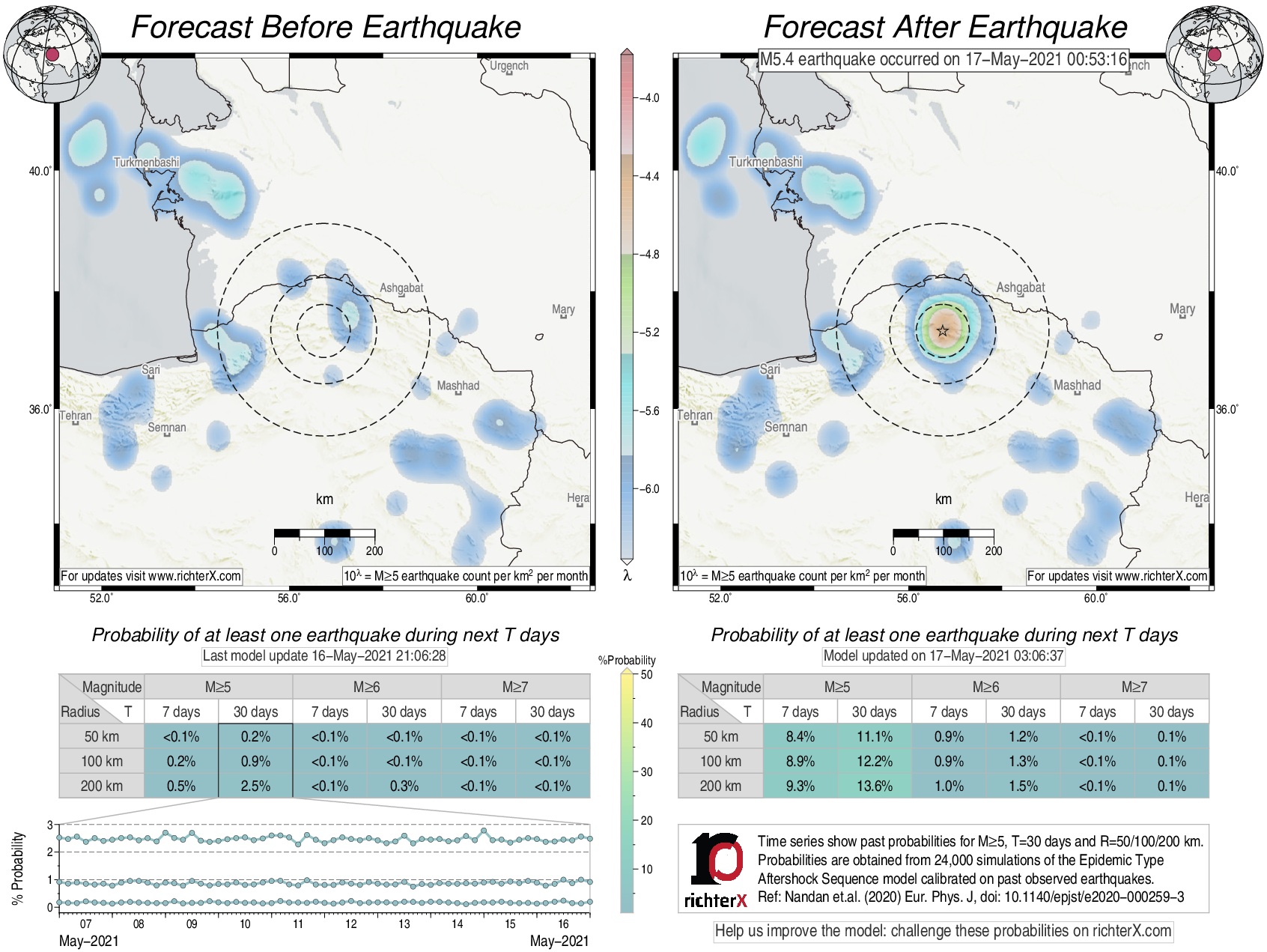 Description: Above is our model's last forecast before the earthquake (left side) and the first forecast after the earthquake (right side). The probabilities are obtained by counting the fraction of simulations that had at least one earthquake above different magnitudes (M5, M6 or M7) within different areas (50, 100 or 200 km) in the next 7 or 30 days. The last 10 day time history of the probabilities (for M5+ during the next 30 days) is shown on the lower left side.