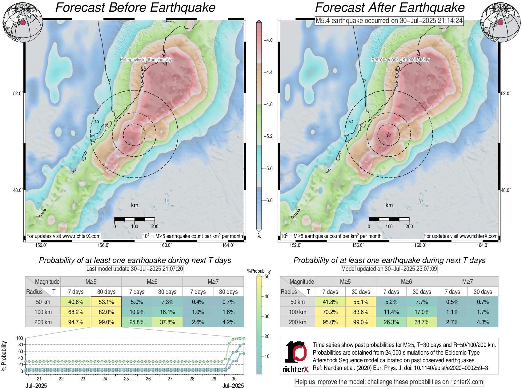 Description: Above is our model's last forecast before the earthquake (left side) and the first forecast after the earthquake (right side). The probabilities are obtained by counting the fraction of simulations that had at least one earthquake above different magnitudes (M5, M6 or M7) within different areas (50, 100 or 200 km) in the next 7 or 30 days. The last 10 day time history of the probabilities (for M5+ during the next 30 days) is shown on the lower left side.