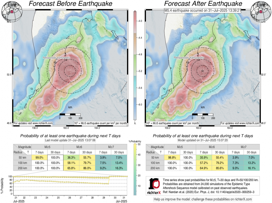 Description: Above is our model's last forecast before the earthquake (left side) and the first forecast after the earthquake (right side). The probabilities are obtained by counting the fraction of simulations that had at least one earthquake above different magnitudes (M5, M6 or M7) within different areas (50, 100 or 200 km) in the next 7 or 30 days. The last 10 day time history of the probabilities (for M5+ during the next 30 days) is shown on the lower left side.