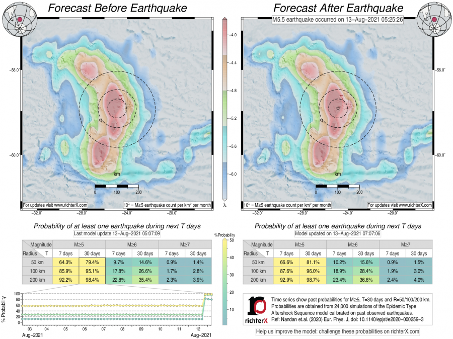 Description: Above is our model's last forecast before the earthquake (left side) and the first forecast after the earthquake (right side). The probabilities are obtained by counting the fraction of simulations that had at least one earthquake above different magnitudes (M5, M6 or M7) within different areas (50, 100 or 200 km) in the next 7 or 30 days. The last 10 day time history of the probabilities (for M5+ during the next 30 days) is shown on the lower left side.