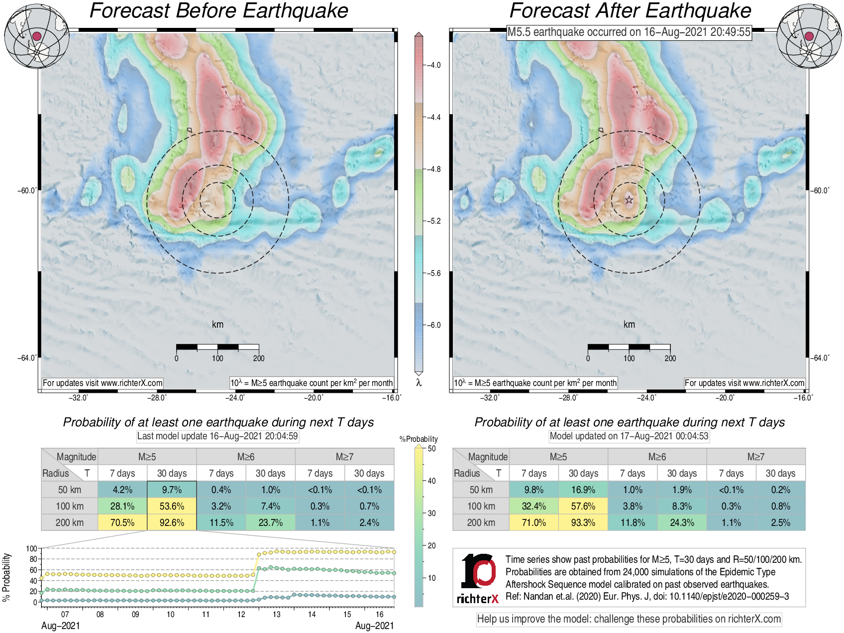 Description: Above is our model's last forecast before the earthquake (left side) and the first forecast after the earthquake (right side). The probabilities are obtained by counting the fraction of simulations that had at least one earthquake above different magnitudes (M5, M6 or M7) within different areas (50, 100 or 200 km) in the next 7 or 30 days. The last 10 day time history of the probabilities (for M5+ during the next 30 days) is shown on the lower left side.