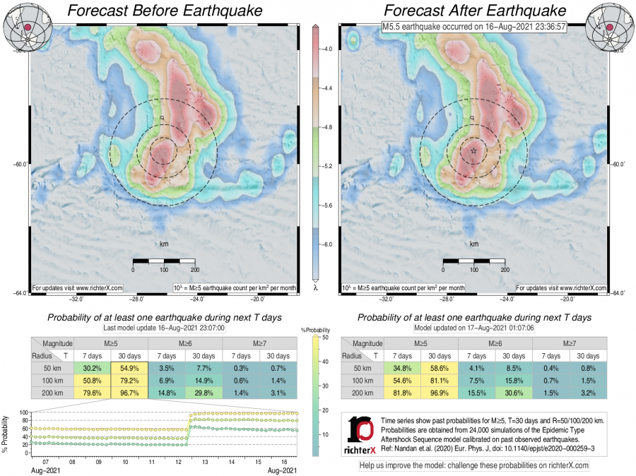 Description: Above is our model's last forecast before the earthquake (left side) and the first forecast after the earthquake (right side). The probabilities are obtained by counting the fraction of simulations that had at least one earthquake above different magnitudes (M5, M6 or M7) within different areas (50, 100 or 200 km) in the next 7 or 30 days. The last 10 day time history of the probabilities (for M5+ during the next 30 days) is shown on the lower left side.
