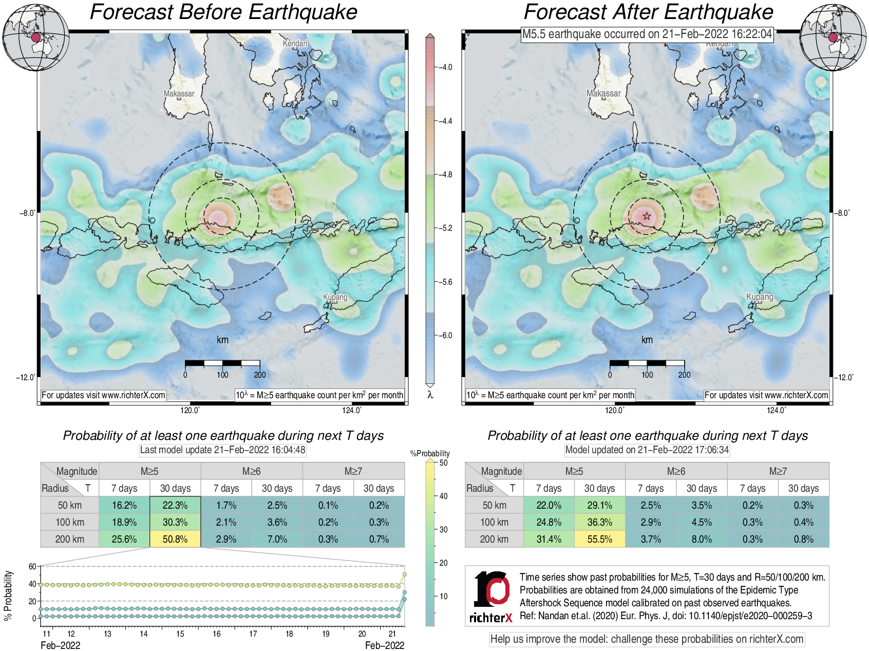 Description: Above is our model's last forecast before the earthquake (left side) and the first forecast after the earthquake (right side). The probabilities are obtained by counting the fraction of simulations that had at least one earthquake above different magnitudes (M5, M6 or M7) within different areas (50, 100 or 200 km) in the next 7 or 30 days. The last 10 day time history of the probabilities (for M5+ during the next 30 days) is shown on the lower left side.