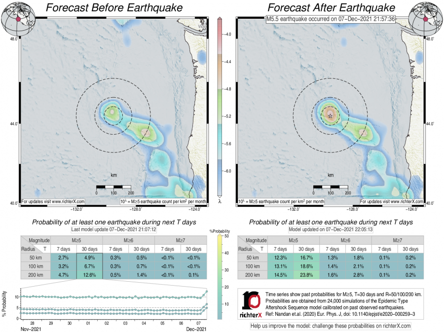 Earthquake Forecast following M5.5 offshore Oregon, USA