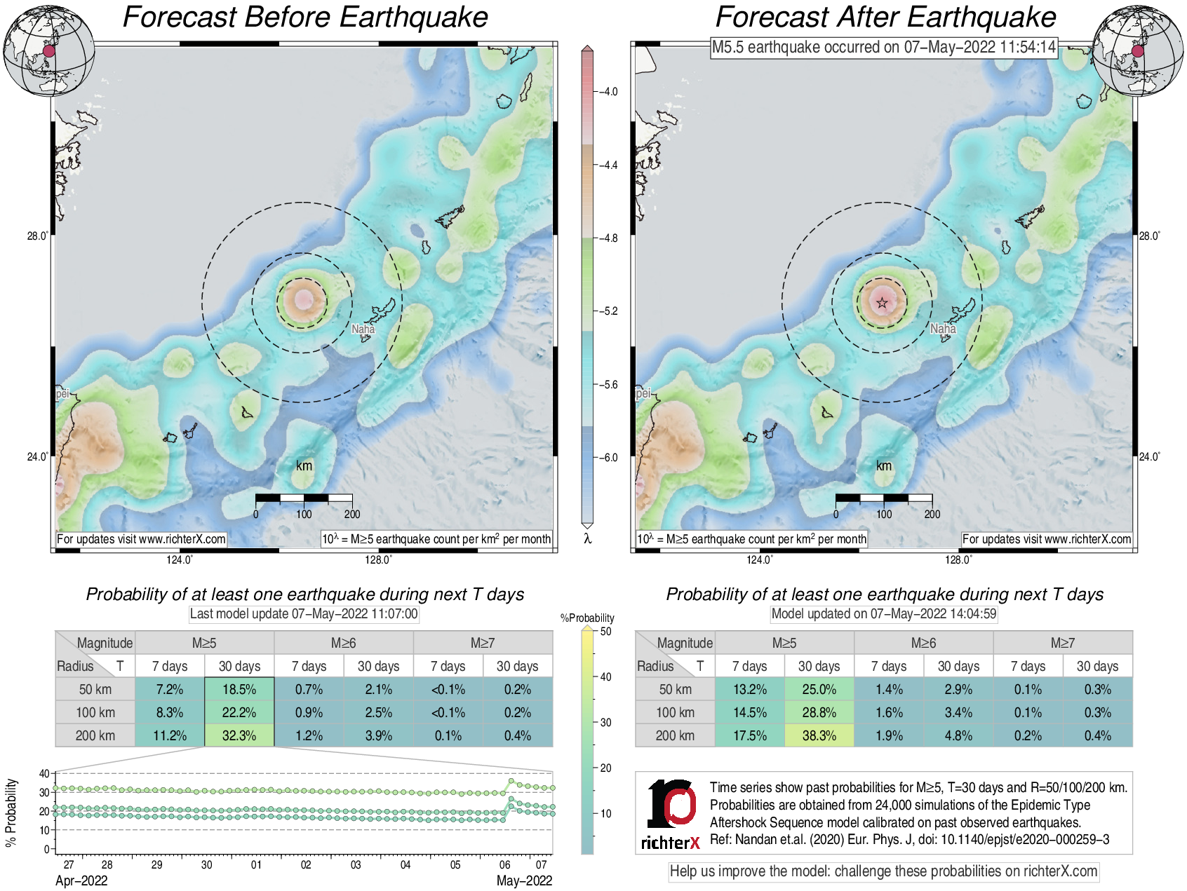 Description: Above is our model's last forecast before the earthquake (left side) and the first forecast after the earthquake (right side). The probabilities are obtained by counting the fraction of simulations that had at least one earthquake above different magnitudes (M5, M6 or M7) within different areas (50, 100 or 200 km) in the next 7 or 30 days. The last 10 day time history of the probabilities (for M5+ during the next 30 days) is shown on the lower left side.