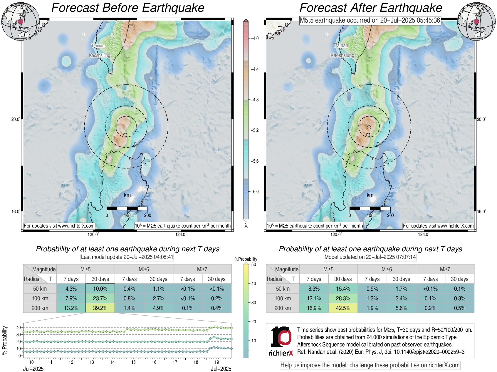 Description: Above is our model's last forecast before the earthquake (left side) and the first forecast after the earthquake (right side). The probabilities are obtained by counting the fraction of simulations that had at least one earthquake above different magnitudes (M5, M6 or M7) within different areas (50, 100 or 200 km) in the next 7 or 30 days. The last 10 day time history of the probabilities (for M5+ during the next 30 days) is shown on the lower left side.