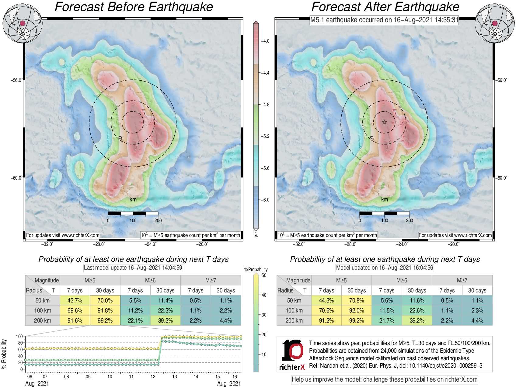 Description: Above is our model's last forecast before the earthquake (left side) and the first forecast after the earthquake (right side). The probabilities are obtained by counting the fraction of simulations that had at least one earthquake above different magnitudes (M5, M6 or M7) within different areas (50, 100 or 200 km) in the next 7 or 30 days. The last 10 day time history of the probabilities (for M5+ during the next 30 days) is shown on the lower left side.