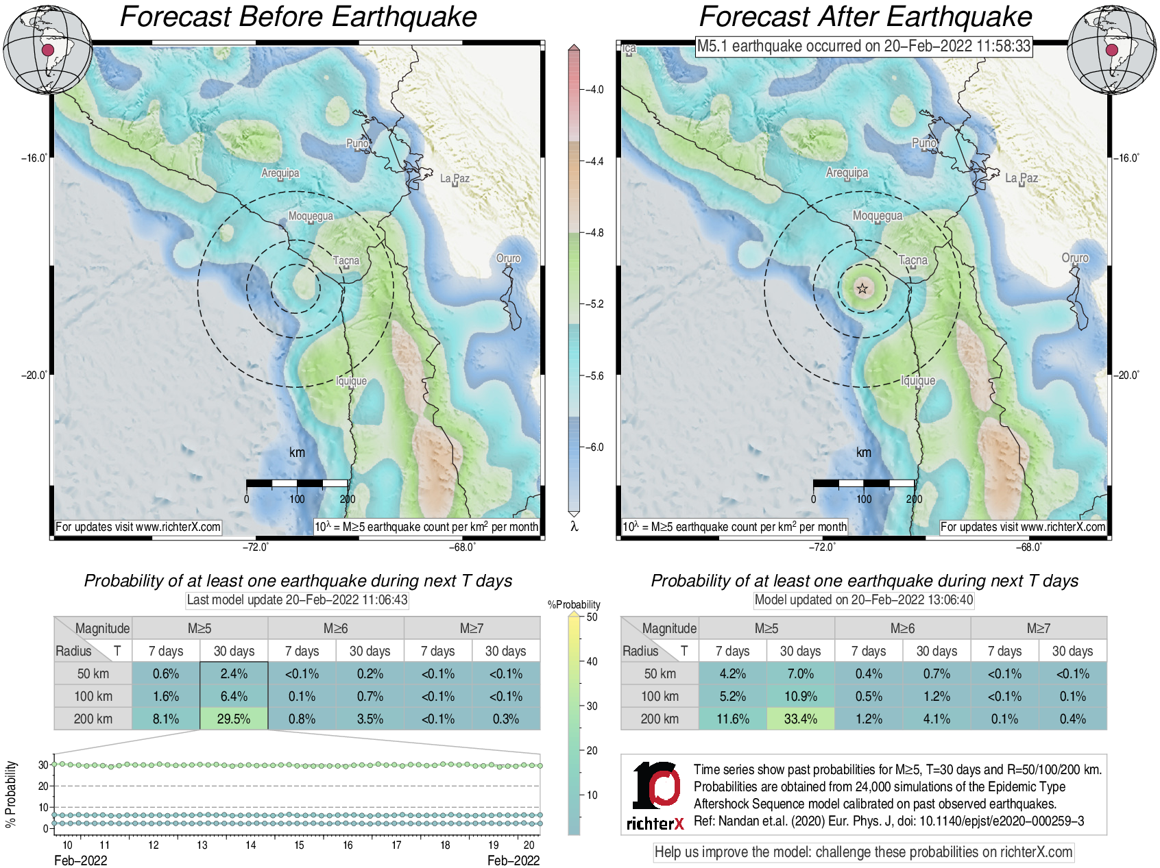 Description: Above is our model's last forecast before the earthquake (left side) and the first forecast after the earthquake (right side). The probabilities are obtained by counting the fraction of simulations that had at least one earthquake above different magnitudes (M5, M6 or M7) within different areas (50, 100 or 200 km) in the next 7 or 30 days. The last 10 day time history of the probabilities (for M5+ during the next 30 days) is shown on the lower left side.