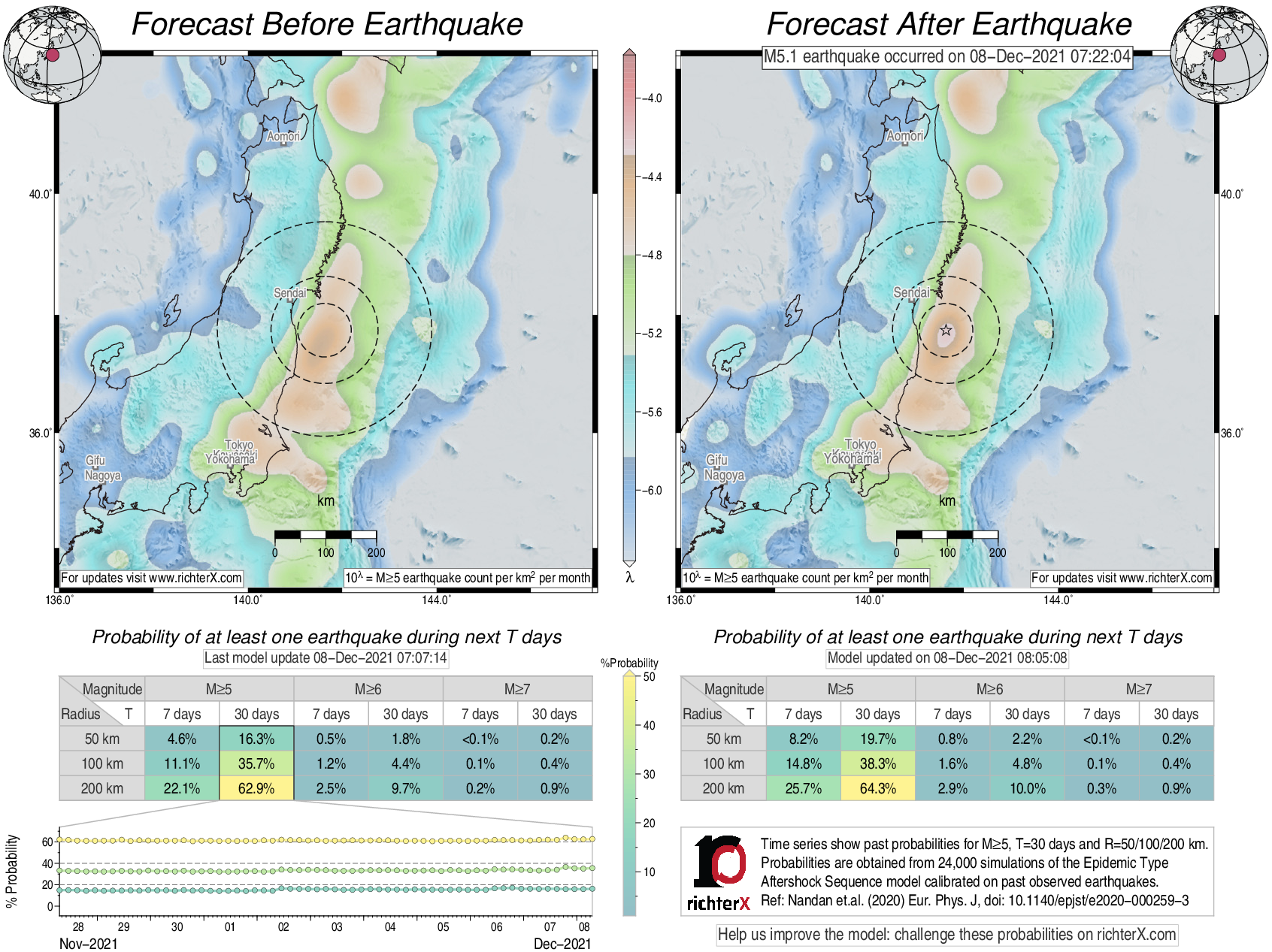 Description: Above is our model's last forecast before the earthquake (left side) and the first forecast after the earthquake (right side). The probabilities are obtained by counting the fraction of simulations that had at least one earthquake above different magnitudes (M5, M6 or M7) within different areas (50, 100 or 200 km) in the next 7 or 30 days. The last 10 day time history of the probabilities (for M5+ during the next 30 days) is shown on the lower left side.