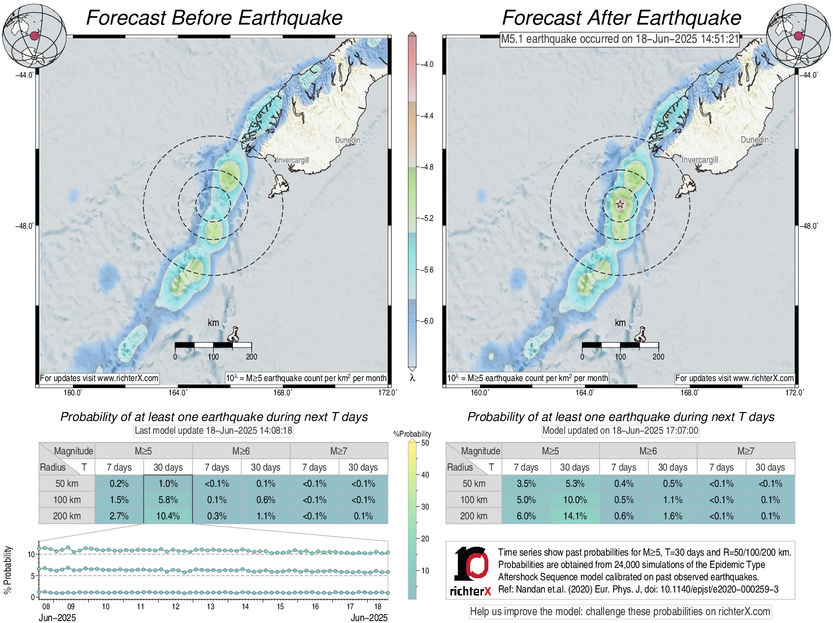 Earthquake Forecast following M5.1 offshore South Island of NZ