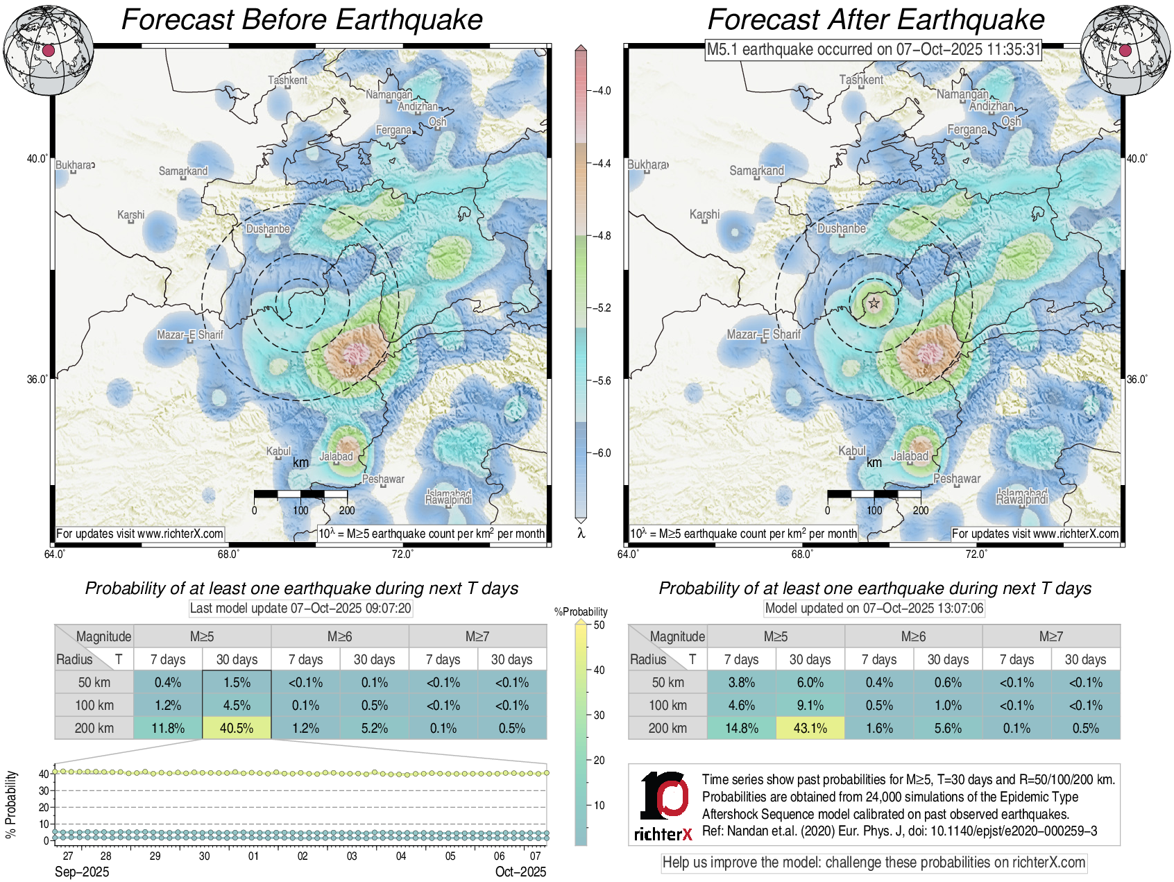 Description: Above is our model's last forecast before the earthquake (left side) and the first forecast after the earthquake (right side). The probabilities are obtained by counting the fraction of simulations that had at least one earthquake above different magnitudes (M5, M6 or M7) within different areas (50, 100 or 200 km) in the next 7 or 30 days. The last 10 day time history of the probabilities (for M5+ during the next 30 days) is shown on the lower left side.