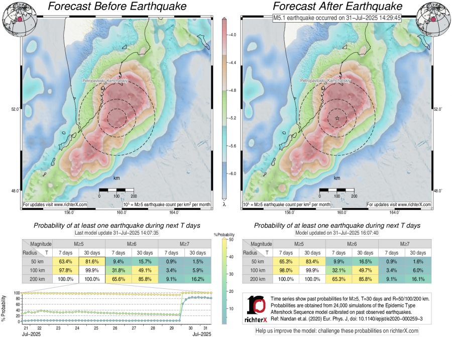 Description: Above is our model's last forecast before the earthquake (left side) and the first forecast after the earthquake (right side). The probabilities are obtained by counting the fraction of simulations that had at least one earthquake above different magnitudes (M5, M6 or M7) within different areas (50, 100 or 200 km) in the next 7 or 30 days. The last 10 day time history of the probabilities (for M5+ during the next 30 days) is shown on the lower left side.