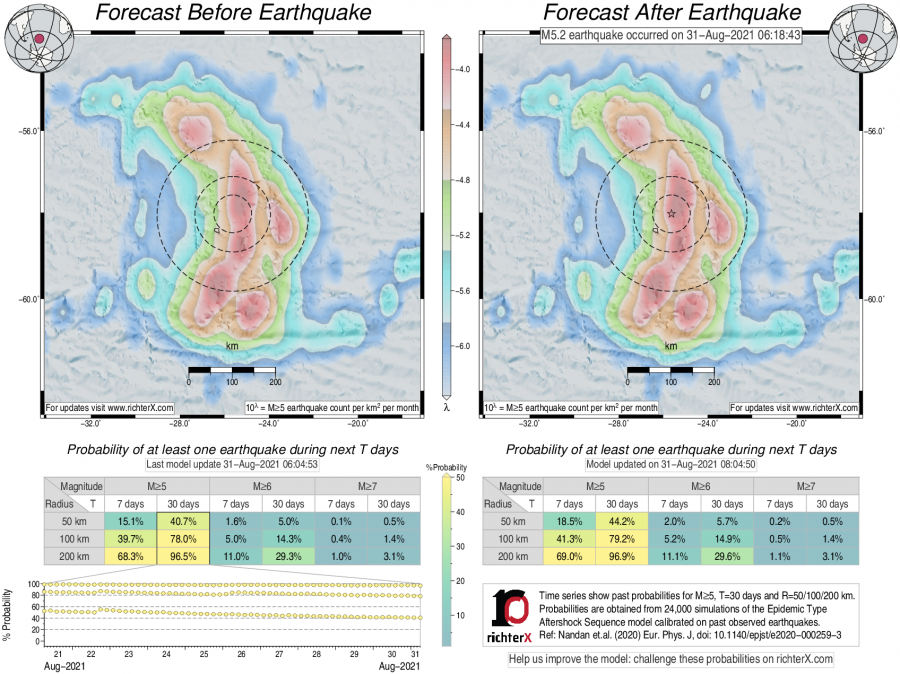 Description: Above is our model's last forecast before the earthquake (left side) and the first forecast after the earthquake (right side). The probabilities are obtained by counting the fraction of simulations that had at least one earthquake above different magnitudes (M5, M6 or M7) within different areas (50, 100 or 200 km) in the next 7 or 30 days. The last 10 day time history of the probabilities (for M5+ during the next 30 days) is shown on the lower left side.