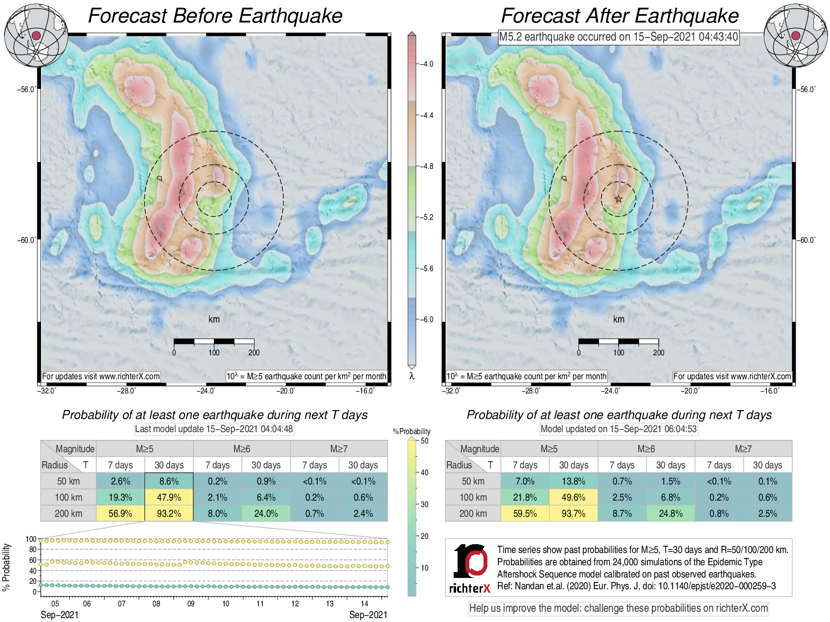 Description: Above is our model's last forecast before the earthquake (left side) and the first forecast after the earthquake (right side). The probabilities are obtained by counting the fraction of simulations that had at least one earthquake above different magnitudes (M5, M6 or M7) within different areas (50, 100 or 200 km) in the next 7 or 30 days. The last 10 day time history of the probabilities (for M5+ during the next 30 days) is shown on the lower left side.