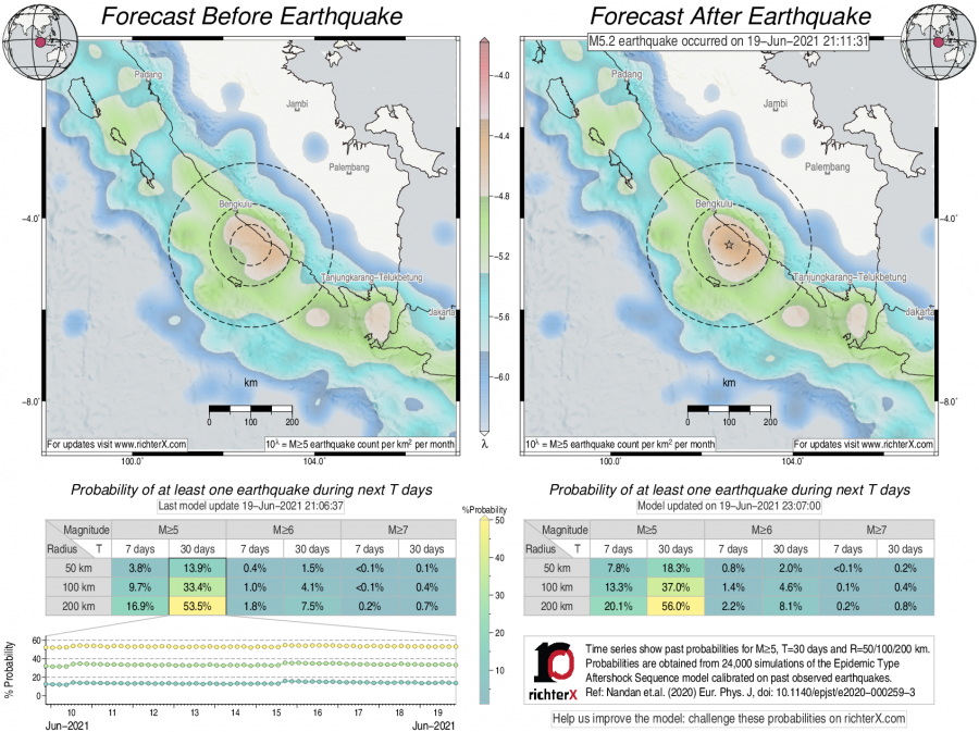 Description: Above is our model's last forecast before the earthquake (left side) and the first forecast after the earthquake (right side). The probabilities are obtained by counting the fraction of simulations that had at least one earthquake above different magnitudes (M5, M6 or M7) within different areas (50, 100 or 200 km) in the next 7 or 30 days. The last 10 day time history of the probabilities (for M5+ during the next 30 days) is shown on the lower left side.