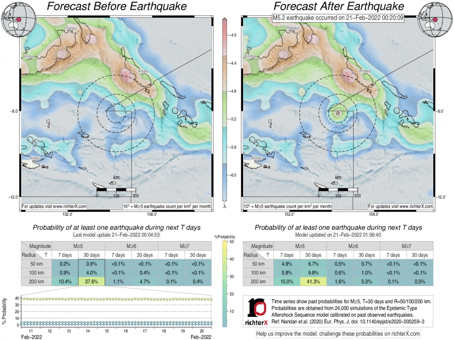 Description: Above is our model's last forecast before the earthquake (left side) and the first forecast after the earthquake (right side). The probabilities are obtained by counting the fraction of simulations that had at least one earthquake above different magnitudes (M5, M6 or M7) within different areas (50, 100 or 200 km) in the next 7 or 30 days. The last 10 day time history of the probabilities (for M5+ during the next 30 days) is shown on the lower left side.
