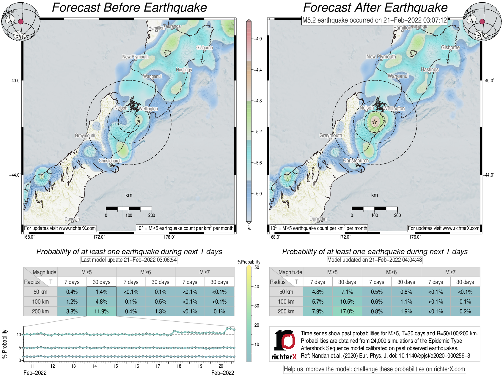 Description: Above is our model's last forecast before the earthquake (left side) and the first forecast after the earthquake (right side). The probabilities are obtained by counting the fraction of simulations that had at least one earthquake above different magnitudes (M5, M6 or M7) within different areas (50, 100 or 200 km) in the next 7 or 30 days. The last 10 day time history of the probabilities (for M5+ during the next 30 days) is shown on the lower left side.