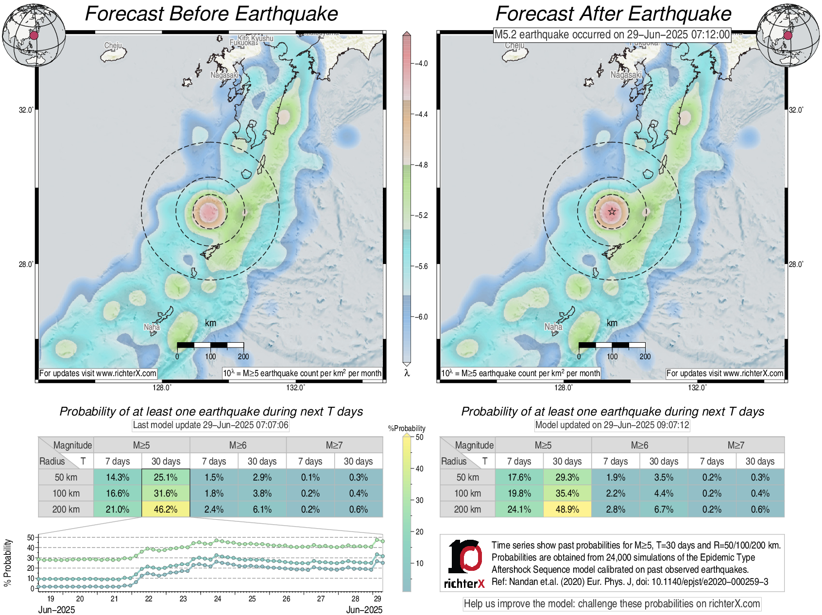 Description: Above is our model's last forecast before the earthquake (left side) and the first forecast after the earthquake (right side). The probabilities are obtained by counting the fraction of simulations that had at least one earthquake above different magnitudes (M5, M6 or M7) within different areas (50, 100 or 200 km) in the next 7 or 30 days. The last 10 day time history of the probabilities (for M5+ during the next 30 days) is shown on the lower left side.