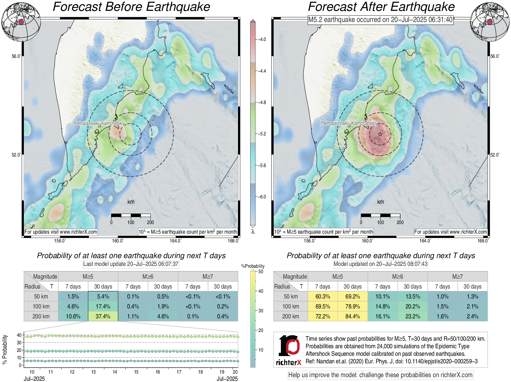Description: Above is our model's last forecast before the earthquake (left side) and the first forecast after the earthquake (right side). The probabilities are obtained by counting the fraction of simulations that had at least one earthquake above different magnitudes (M5, M6 or M7) within different areas (50, 100 or 200 km) in the next 7 or 30 days. The last 10 day time history of the probabilities (for M5+ during the next 30 days) is shown on the lower left side.