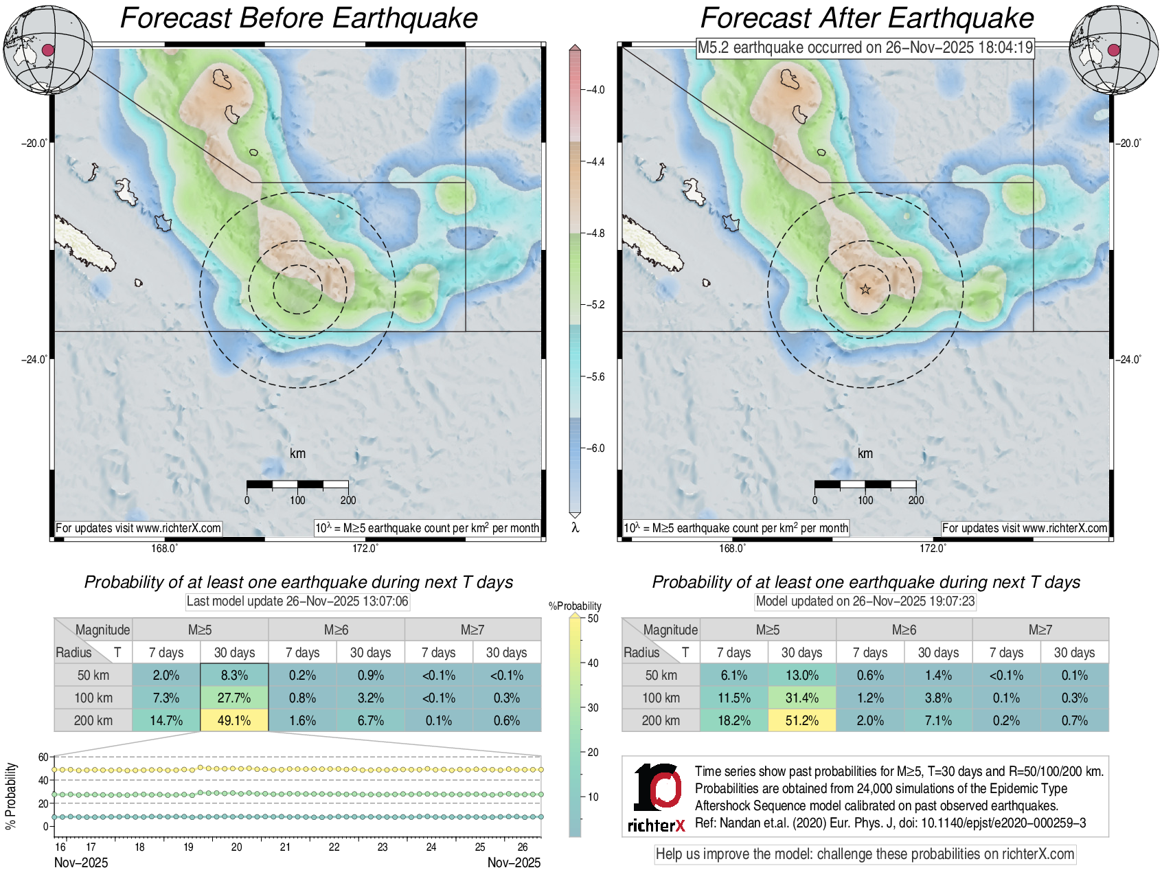 Description: Above is our model's last forecast before the earthquake (left side) and the first forecast after the earthquake (right side). The probabilities are obtained by counting the fraction of simulations that had at least one earthquake above different magnitudes (M5, M6 or M7) within different areas (50, 100 or 200 km) in the next 7 or 30 days. The last 10 day time history of the probabilities (for M5+ during the next 30 days) is shown on the lower left side.