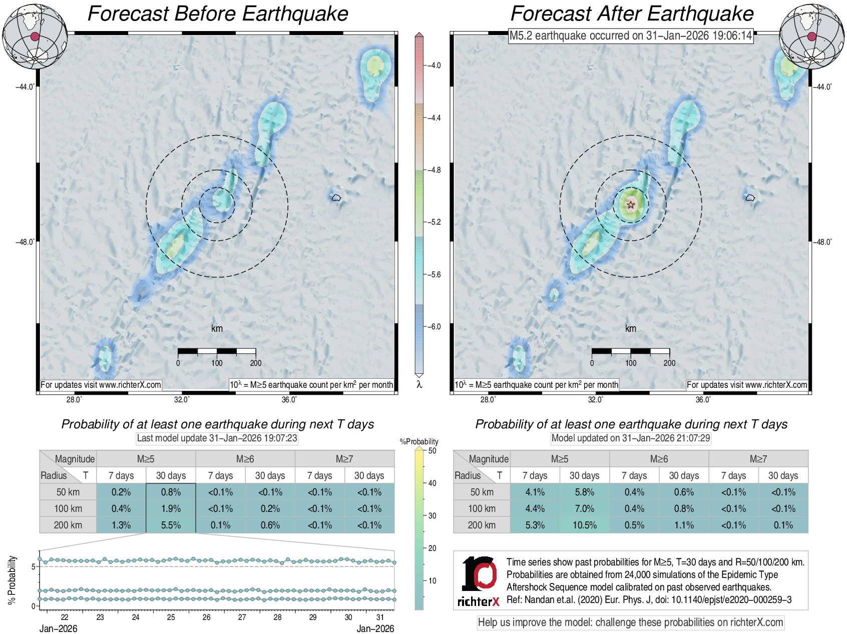 Description: Above is our model's last forecast before the earthquake (left side) and the first forecast after the earthquake (right side). The probabilities are obtained by counting the fraction of simulations that had at least one earthquake above different magnitudes (M5, M6 or M7) within different areas (50, 100 or 200 km) in the next 7 or 30 days. The last 10 day time history of the probabilities (for M5+ during the next 30 days) is shown on the lower left side.