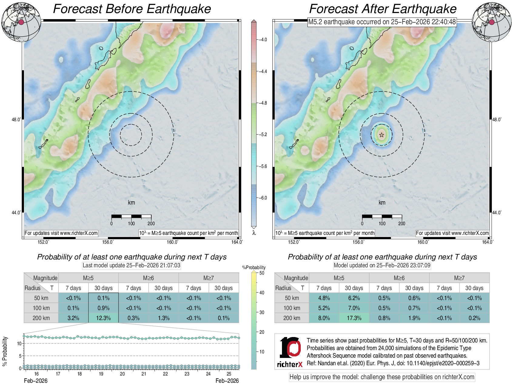 Description: Above is our model's last forecast before the earthquake (left side) and the first forecast after the earthquake (right side). The probabilities are obtained by counting the fraction of simulations that had at least one earthquake above different magnitudes (M5, M6 or M7) within different areas (50, 100 or 200 km) in the next 7 or 30 days. The last 10 day time history of the probabilities (for M5+ during the next 30 days) is shown on the lower left side.
