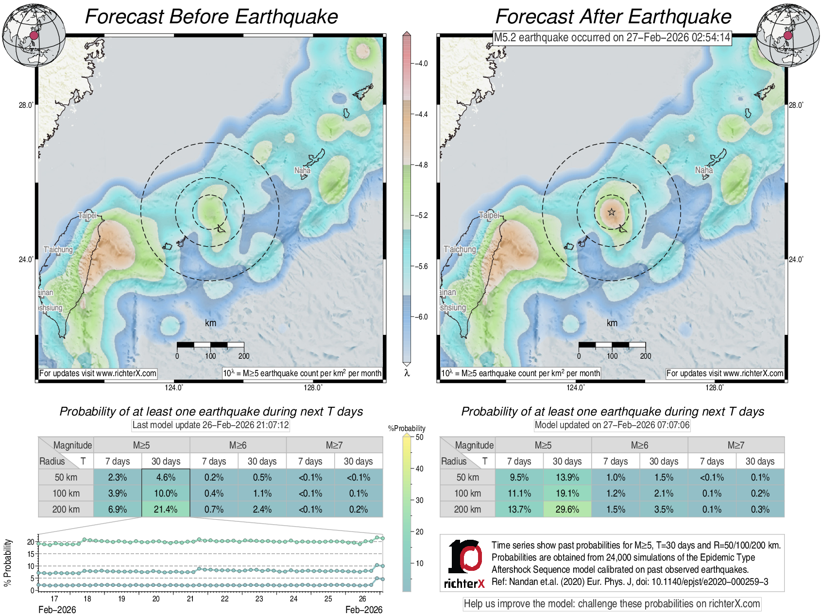 Description: Above is our model's last forecast before the earthquake (left side) and the first forecast after the earthquake (right side). The probabilities are obtained by counting the fraction of simulations that had at least one earthquake above different magnitudes (M5, M6 or M7) within different areas (50, 100 or 200 km) in the next 7 or 30 days. The last 10 day time history of the probabilities (for M5+ during the next 30 days) is shown on the lower left side.