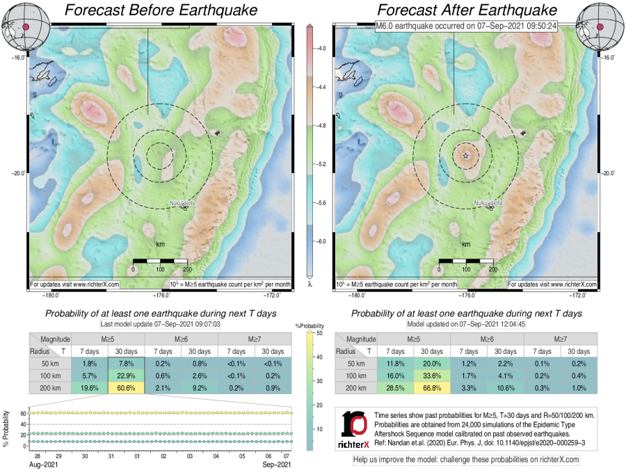 Description: Above is our model's last forecast before the earthquake (left side) and the first forecast after the earthquake (right side). The probabilities are obtained by counting the fraction of simulations that had at least one earthquake above different magnitudes (M5, M6 or M7) within different areas (50, 100 or 200 km) in the next 7 or 30 days. The last 10 day time history of the probabilities (for M5+ during the next 30 days) is shown on the lower left side.
