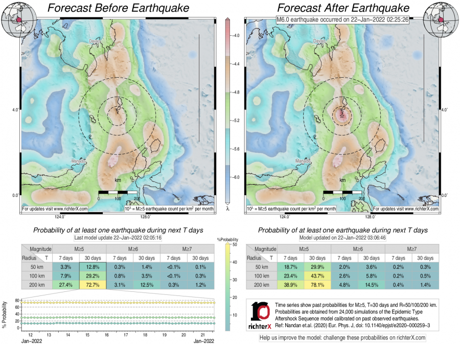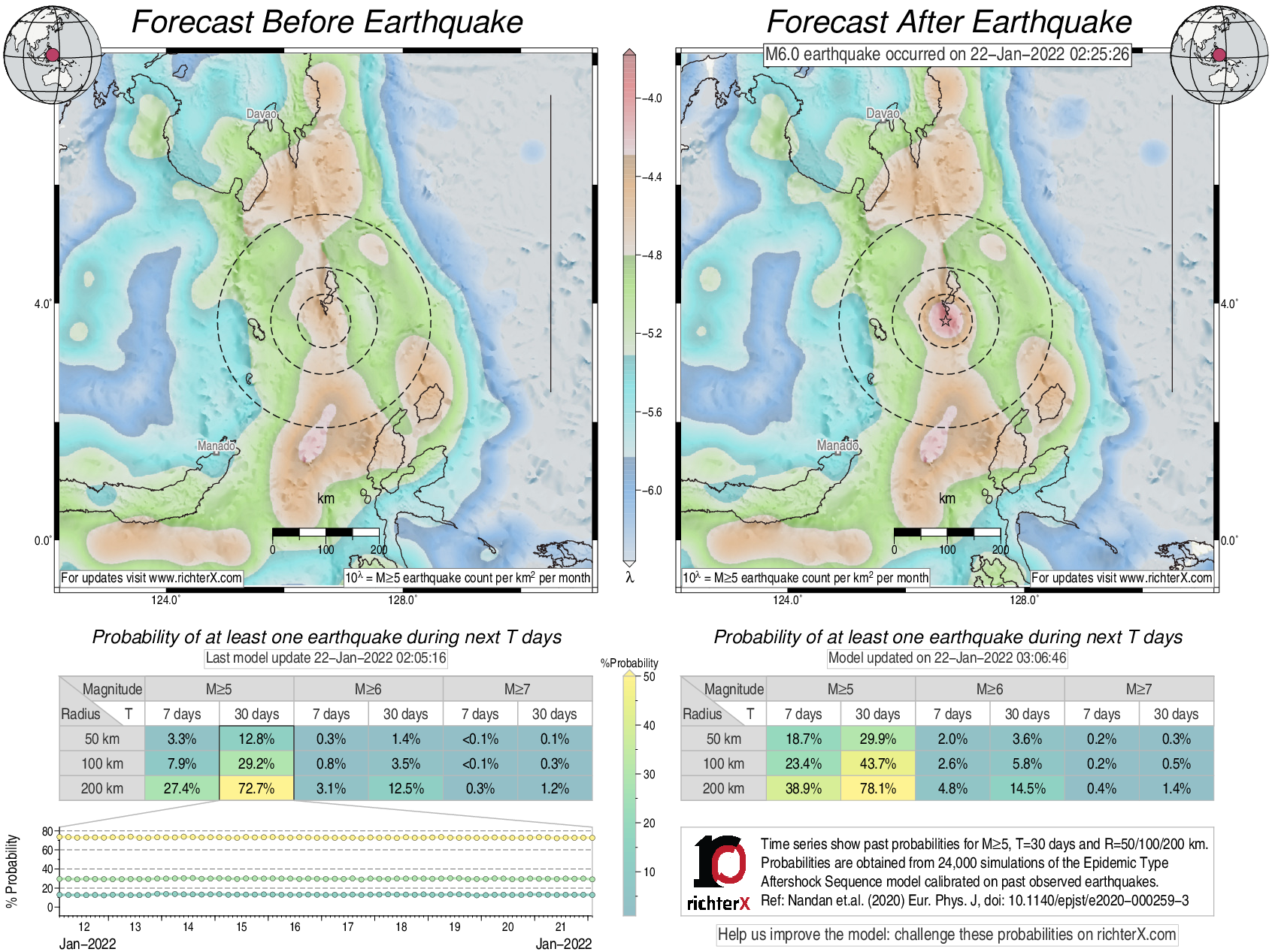 Description: Above is our model's last forecast before the earthquake (left side) and the first forecast after the earthquake (right side). The probabilities are obtained by counting the fraction of simulations that had at least one earthquake above different magnitudes (M5, M6 or M7) within different areas (50, 100 or 200 km) in the next 7 or 30 days. The last 10 day time history of the probabilities (for M5+ during the next 30 days) is shown on the lower left side.