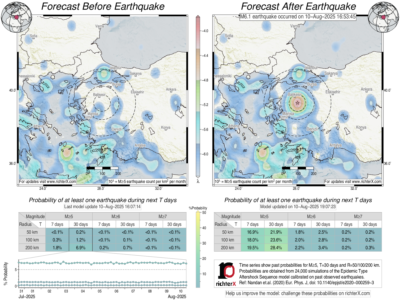 Description: Above is our model's last forecast before the earthquake (left side) and the first forecast after the earthquake (right side). The probabilities are obtained by counting the fraction of simulations that had at least one earthquake above different magnitudes (M5, M6 or M7) within different areas (50, 100 or 200 km) in the next 7 or 30 days. The last 10 day time history of the probabilities (for M5+ during the next 30 days) is shown on the lower left side.