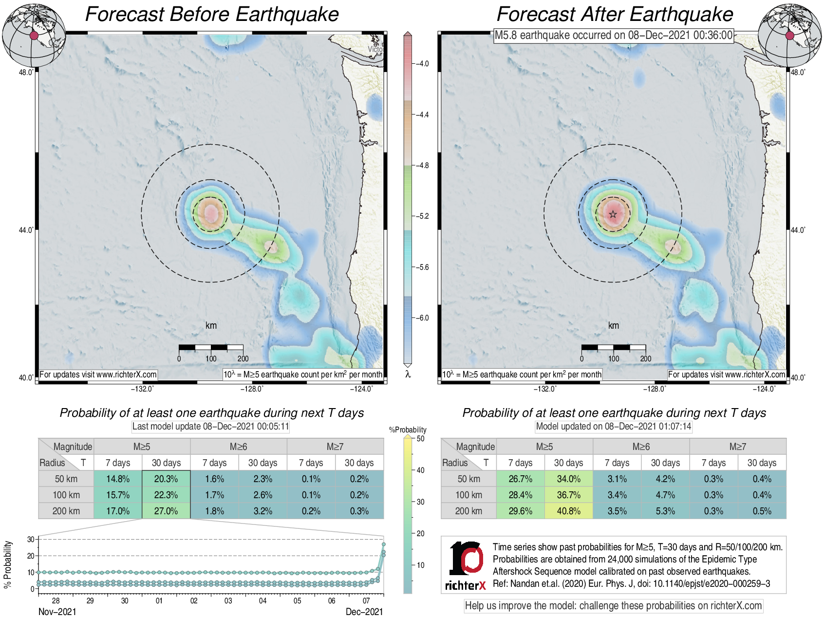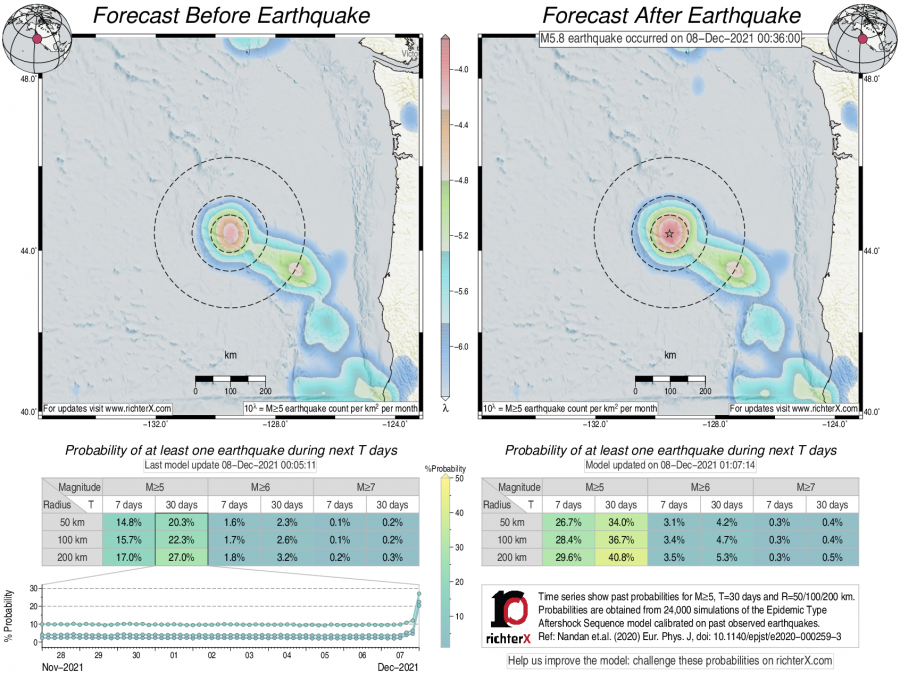 Earthquake Forecast following M5.8 offshore Oregon, USA