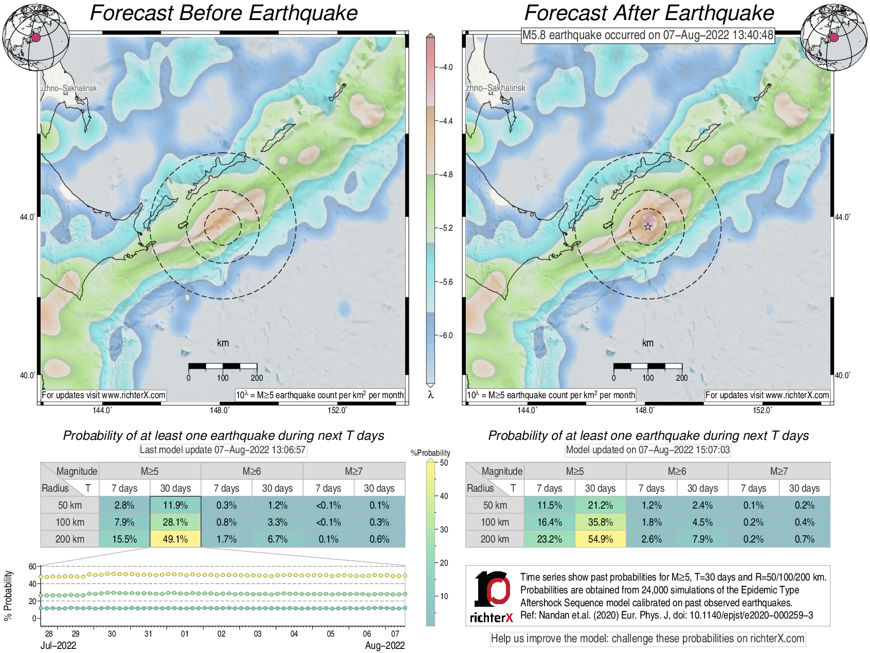 Description: Above is our model's last forecast before the earthquake (left side) and the first forecast after the earthquake (right side). The probabilities are obtained by counting the fraction of simulations that had at least one earthquake above different magnitudes (M5, M6 or M7) within different areas (50, 100 or 200 km) in the next 7 or 30 days. The last 10 day time history of the probabilities (for M5+ during the next 30 days) is shown on the lower left side.